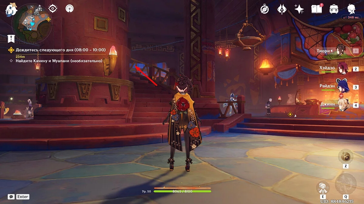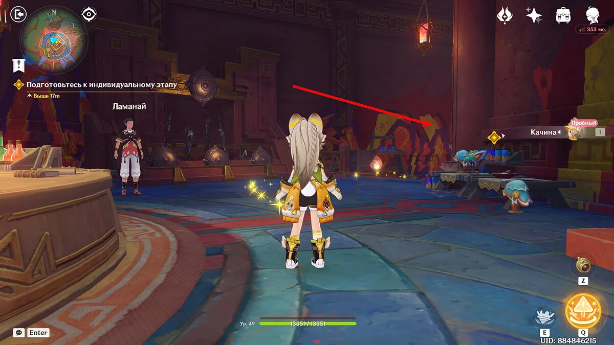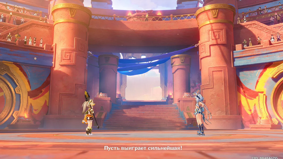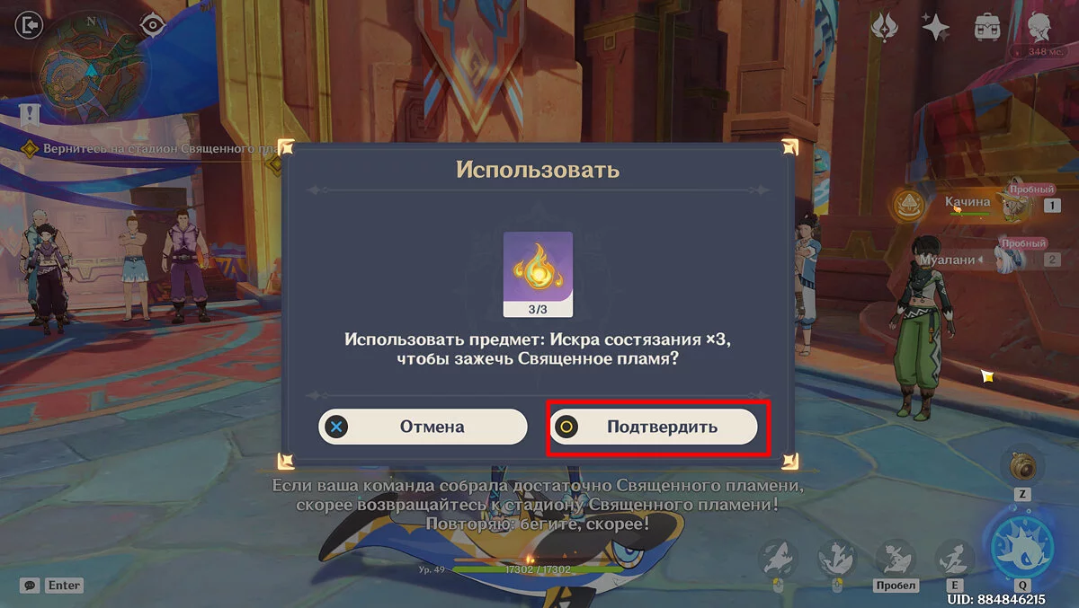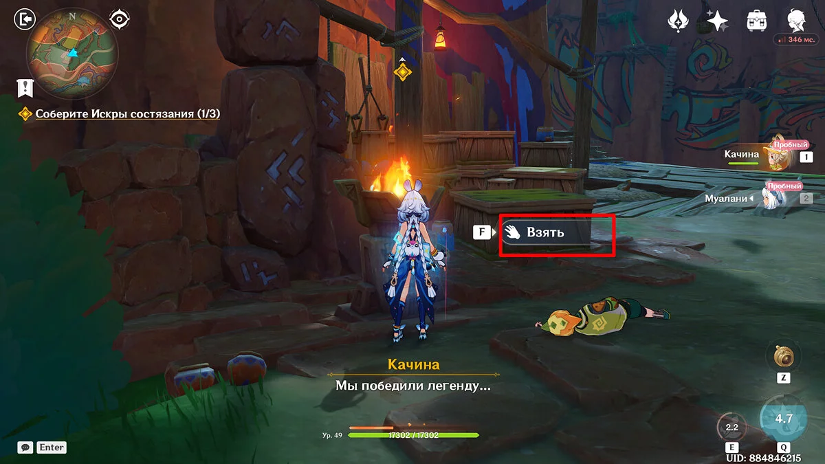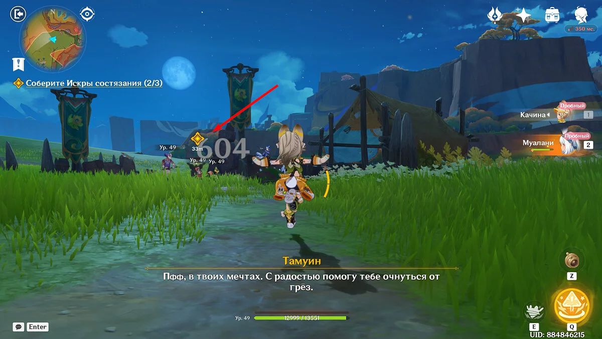 Отдайте собранные искры и Муалани с Качиной отправятся отдыхать перед одиночными боями. Однако в номер к девочке придут двое участников, которые начнут ей угрожать. К счастью, Путешественник подоспеет вовремя. После разговора подготовьтесь к индивидуальному этапу: подойдите к двери, предварительно собрав флогистоновые частицы и начните турнир.