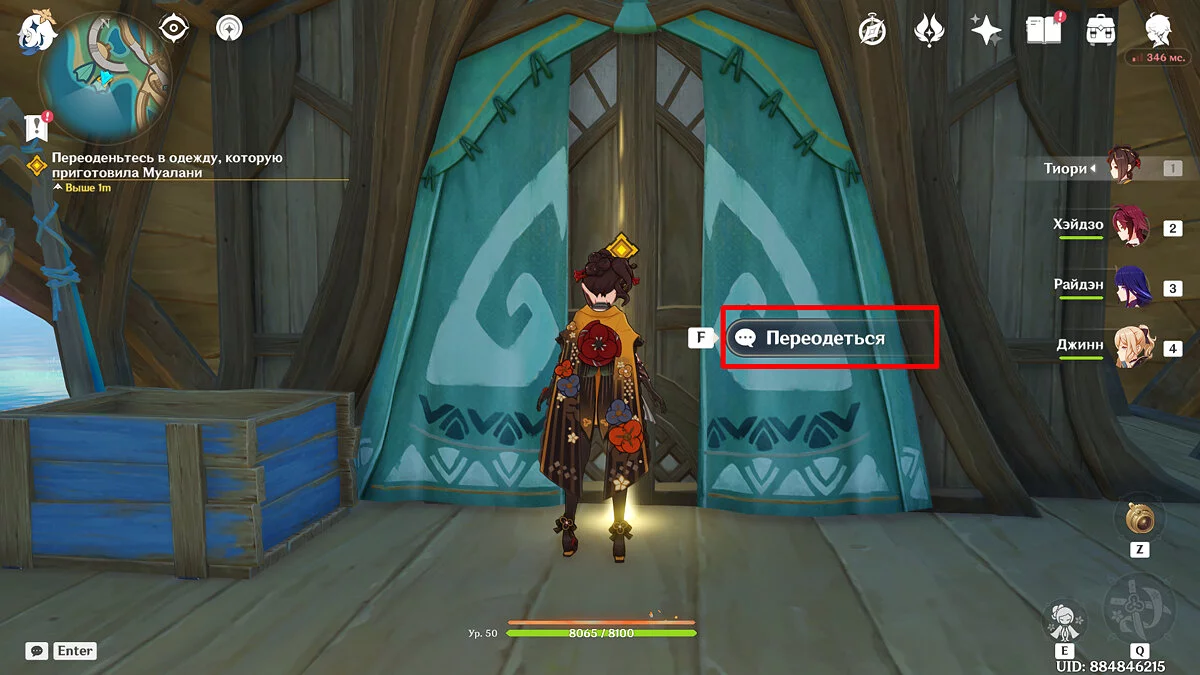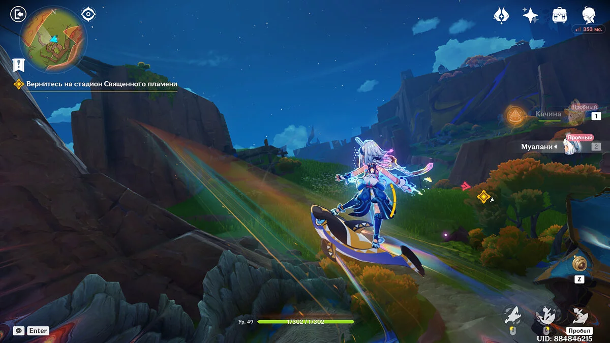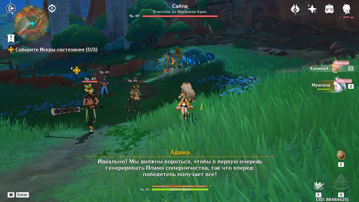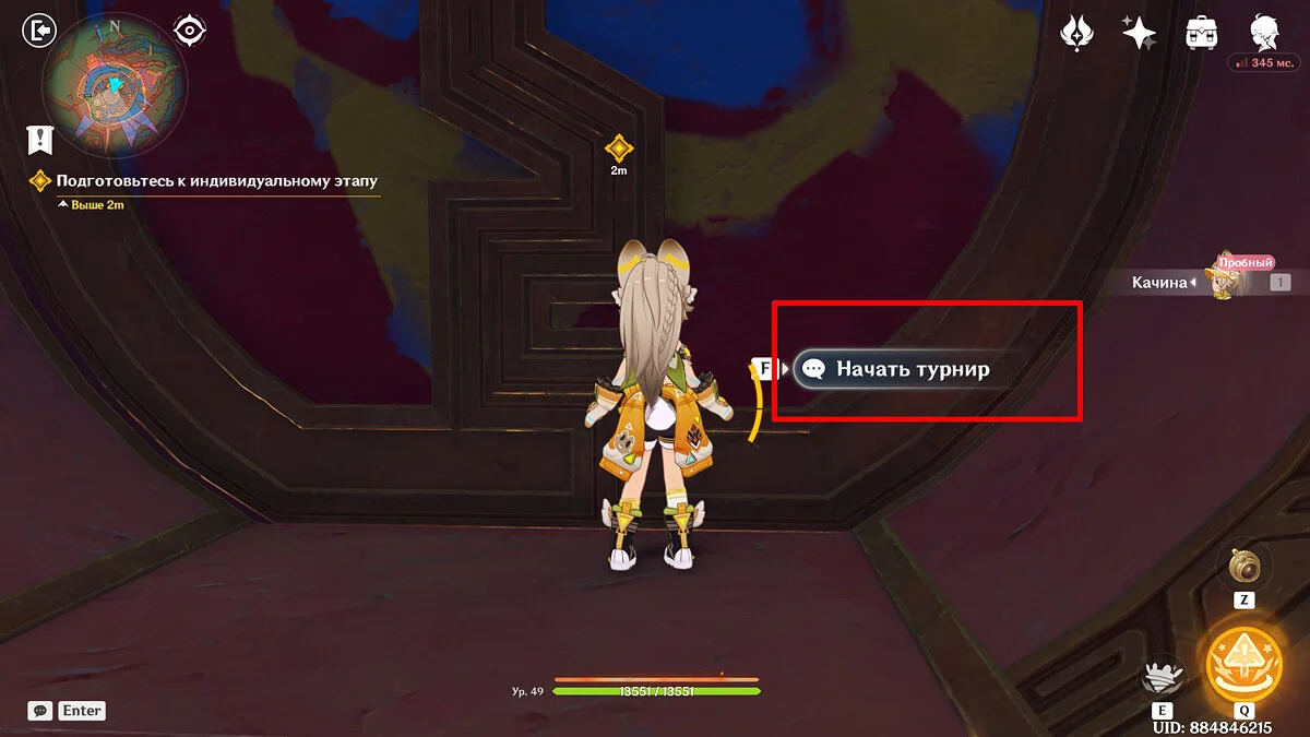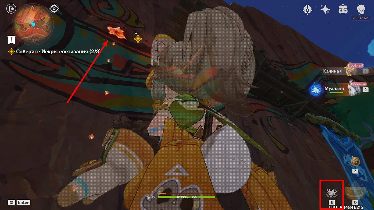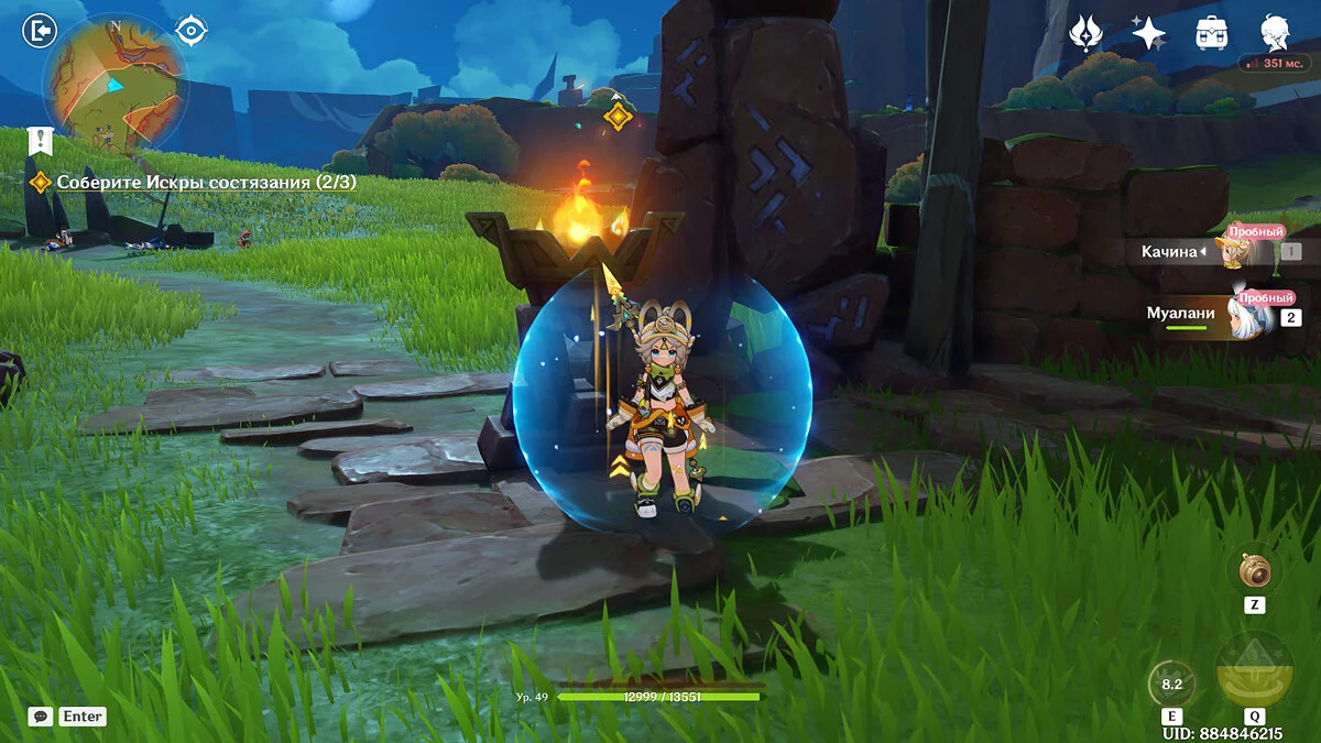 Отдайте собранные искры и Муалани с Качиной отправятся отдыхать перед одиночными боями. Однако в номер к девочке придут двое участников, которые начнут ей угрожать. К счастью, Путешественник подоспеет вовремя. После разговора подготовьтесь к индивидуальному этапу: подойдите к двери, предварительно собрав флогистоновые частицы и начните турнир.