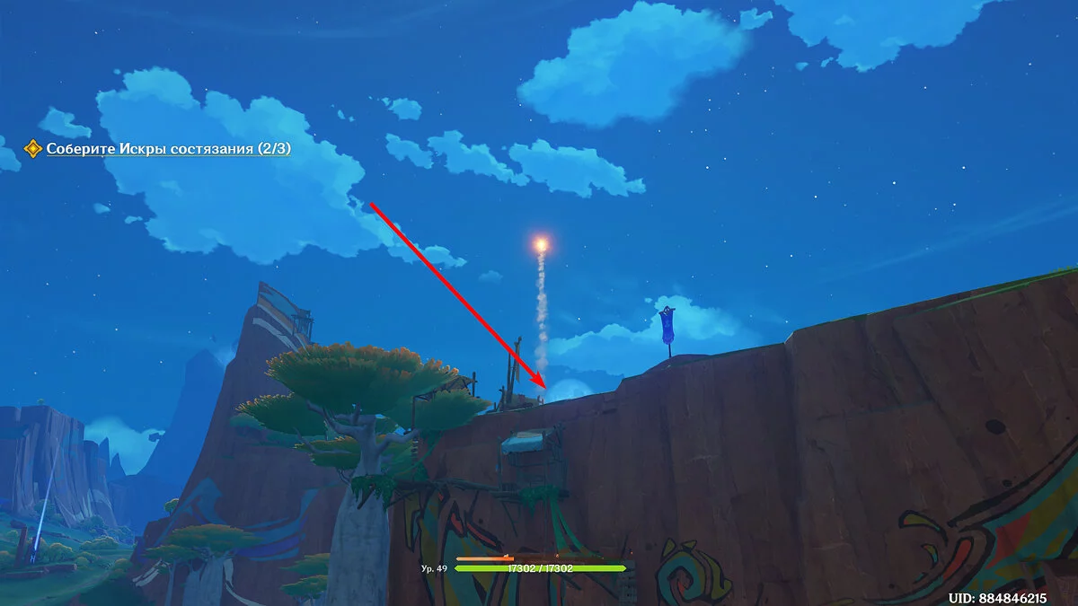 Вторая искра будет справа от предыдущей, на деревянной постройке. Чтобы сократить время карабканья используйте Качину. Всё так же одолейте противников (а так же монстров) и возьмите искру у монумента.