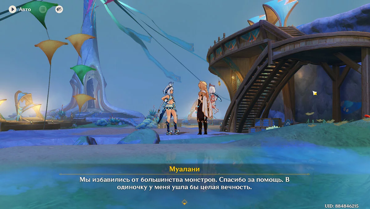Поспать долго Путешественнику и Паймон не получится — снаружи послышатся крики. Вскоре окажется, что на племя внезапно напала Бездна. Помогите людям от неё избавиться и убейте как можно больше монстров с помощью Муалани в отряде.