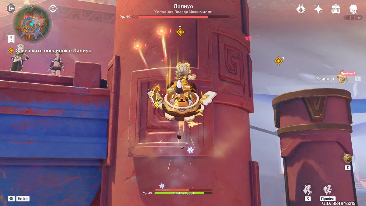 С помощью навыка Качины заберитесь на колонны, на которые соперник поставила ледяные столбы уничтожьте их, чтобы ослабить НПС. Проделайте это несколько раз, а в конце залезьте на центральную платформу и одолейте Лилиуо.
