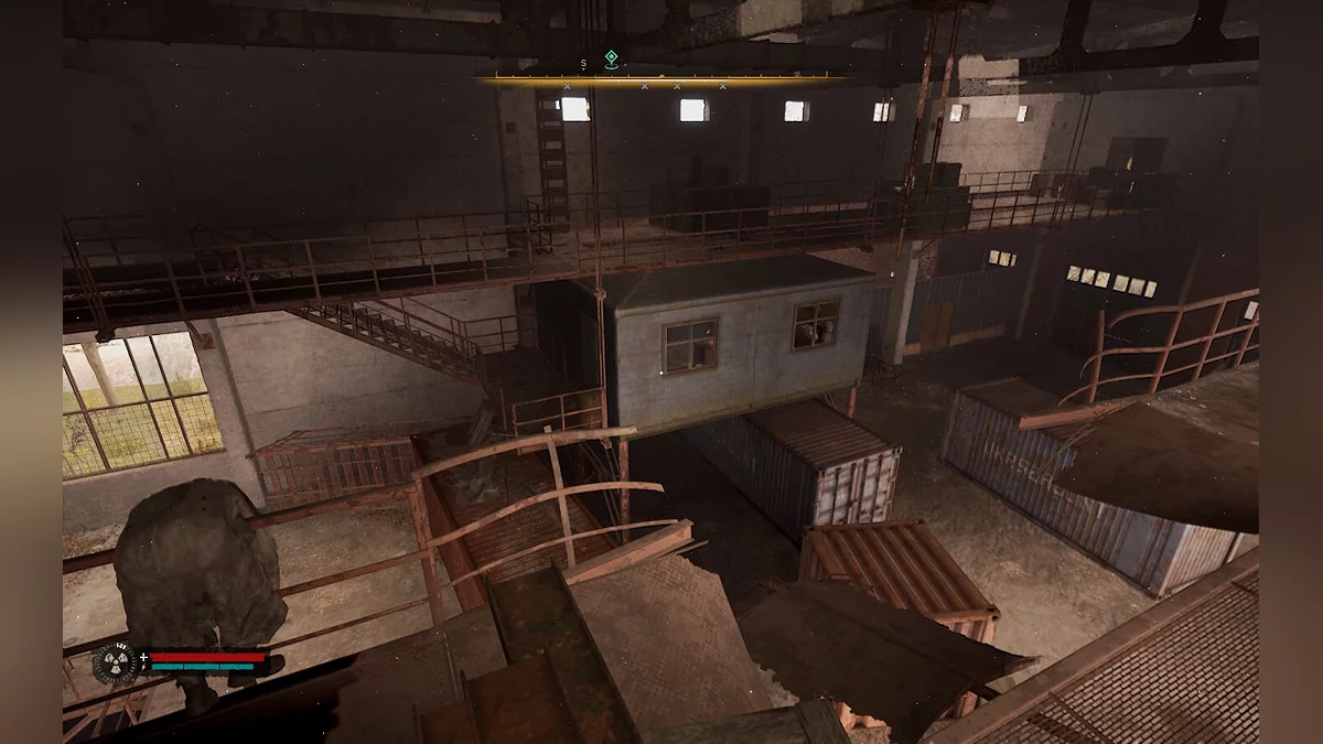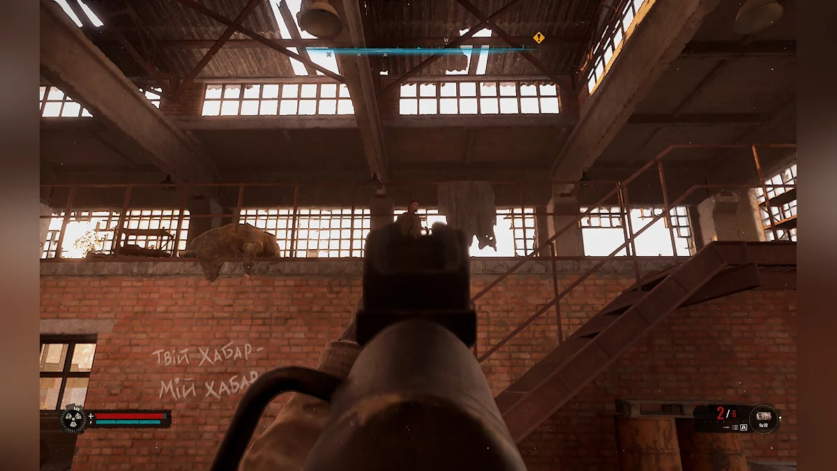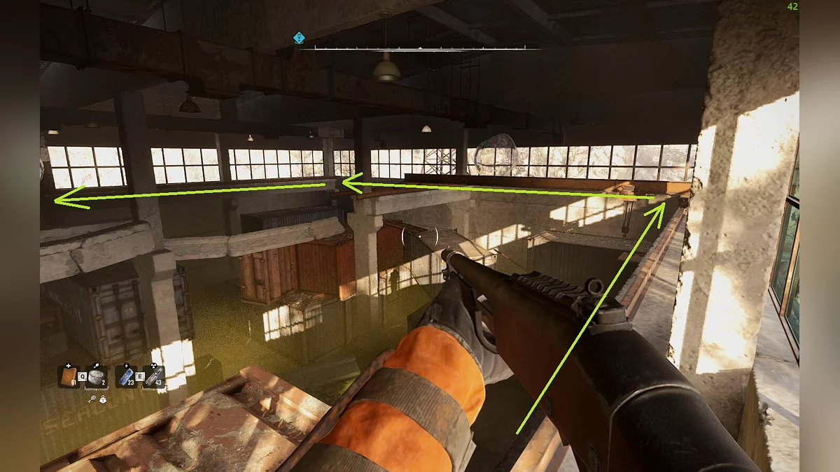 Теперь, когда кабаны уничтожены, вы можете смело возвращаться к Сидоровичу. Однако мы всё же рекомендуем не торопиться и сначала осмотреть тайник, полученный от Стёпы. В этом же помещении поднимитесь по лестнице, пройдите прямо, а затем взберитесь по ещё одной лестнице, ведущей наверх.
