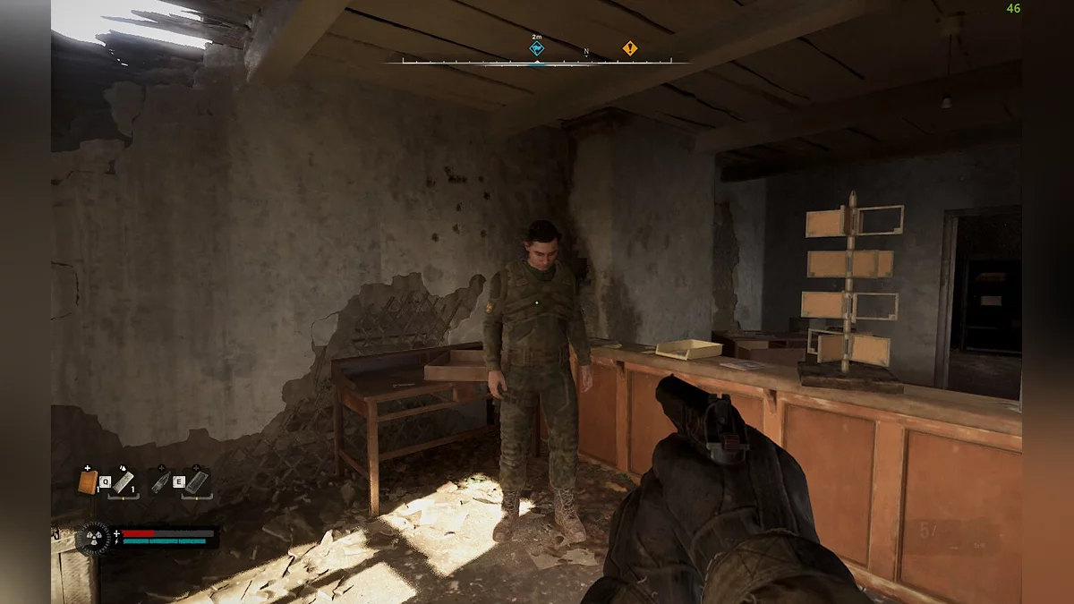 После выполнения первого основного задания, вам предстоит отправиться в Залесье. На пути вам встретятся несколько недоброжелателей, преследующих беззащитного. Разобравшись с этими сталкерами, войдите в помещение и побеседуйте с мужчиной.