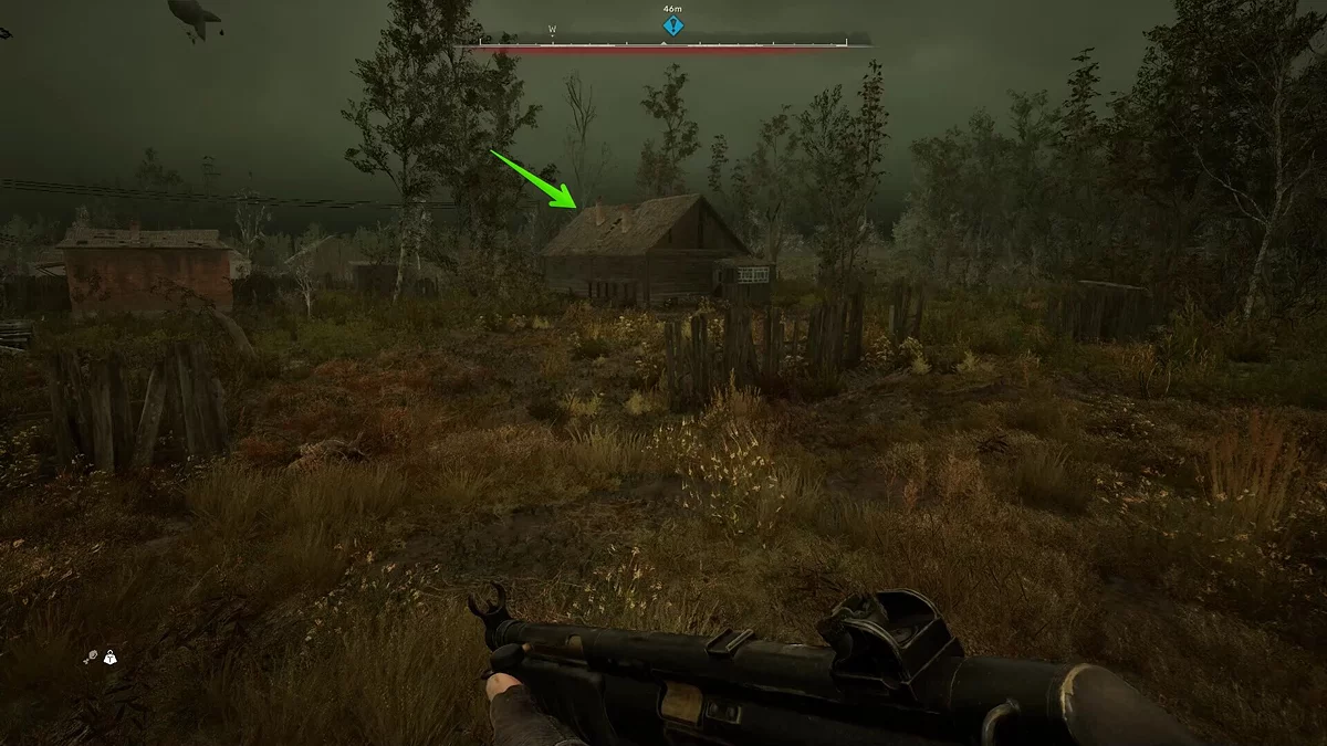 Синяя точка на карте указывает на юго-запад, в одно из зданий поселения Росток, которое расположено в достаточно уединенной части территории. Отправляйтесь в это место и будьте внимательны, входите внутрь с восточной стороны, чтобы не привлекать лишнего внимания.
