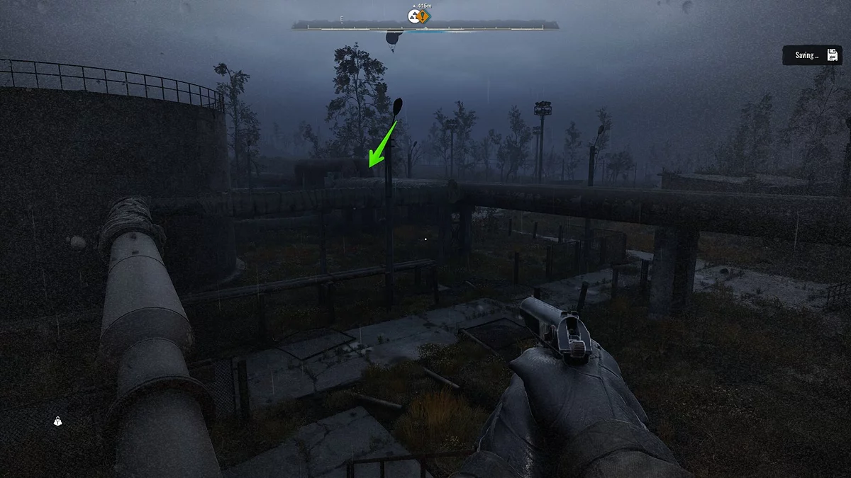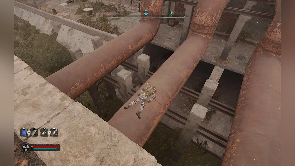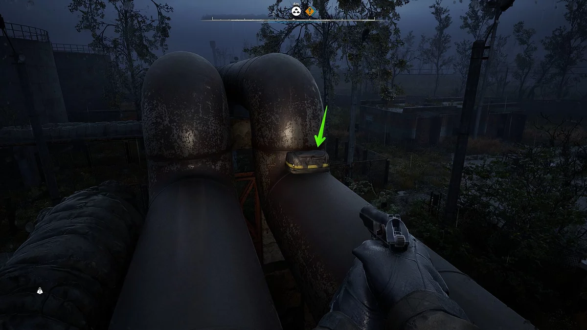 Достать тайник непросто: для этого предварительно придётся забраться на металлическую площадку с лестницей, оттуда на небольшую трубу, а затем перебежать к двум огромным трубам.