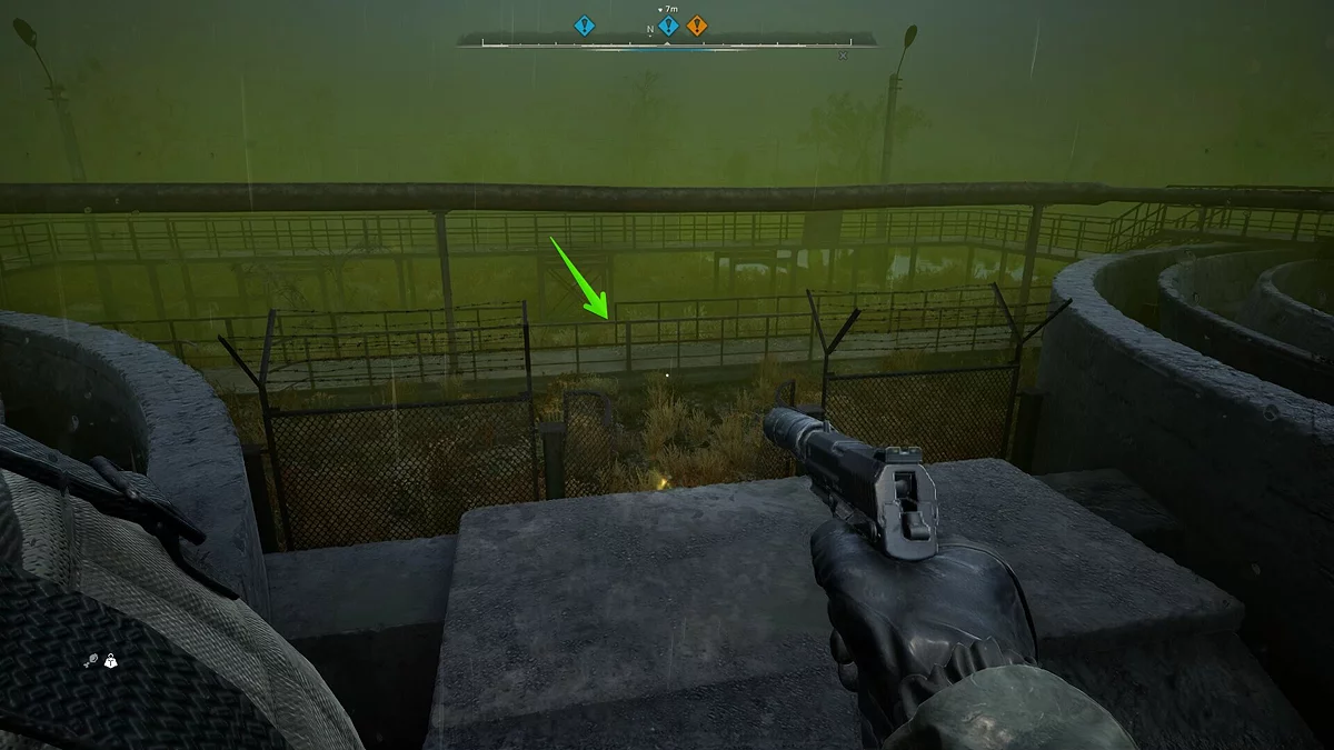 Продолжайте идти по тоннелю, пока не столкнетесь с зелеными и довольно радиоактивными парами. Используйте найденные медикаменты и переходите по мосту, чтобы обнаружить бандитов.