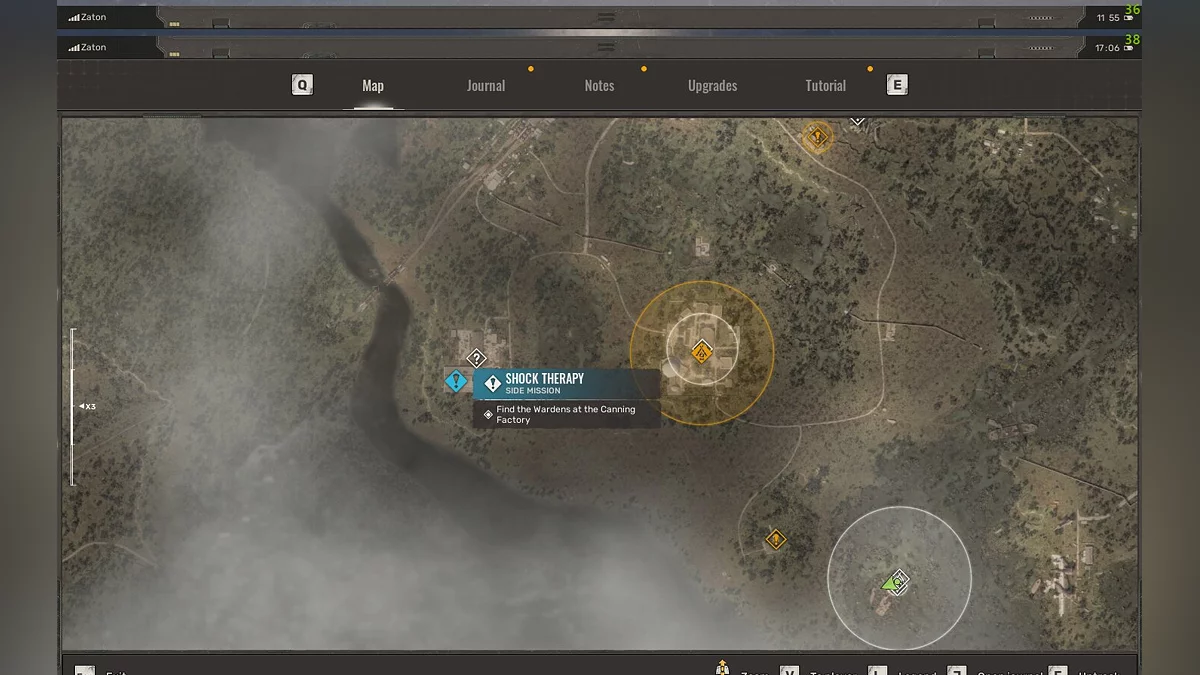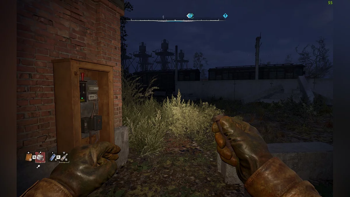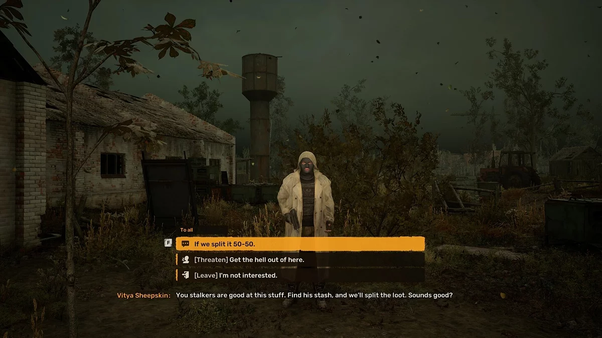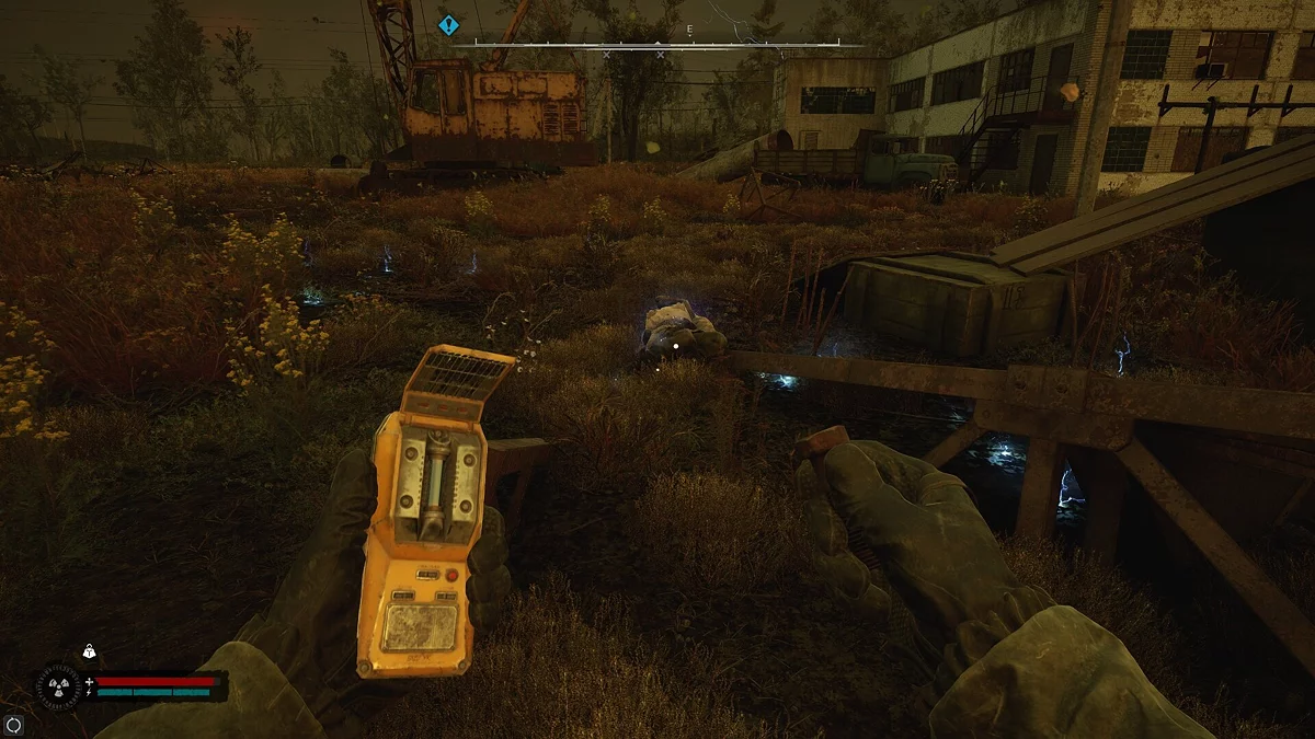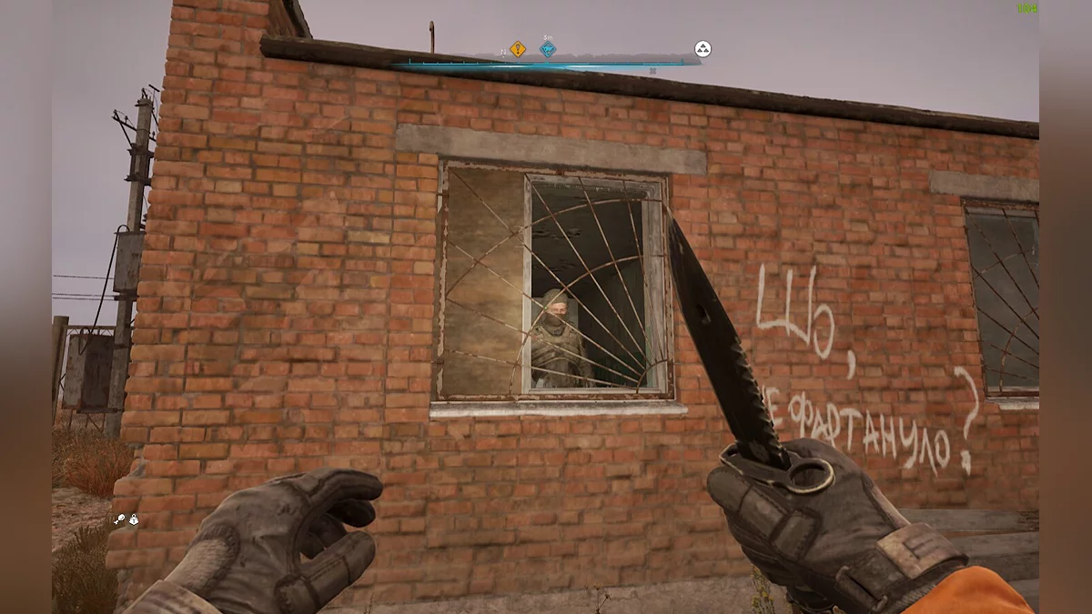 Ваша задача — выбить долг с Гриши Валенка. Направляйтесь к синему маркеру, указывающему на водонапорную башню, и поговорите с бандитами у главного входа. Войти внутрь не получится, поэтому обойдите здание справа и общайтесь с парнем через дыру в стене. После разговора отправляйтесь к водонапорной башне, аккуратно проходя через аномалии, расположенные позади вас.