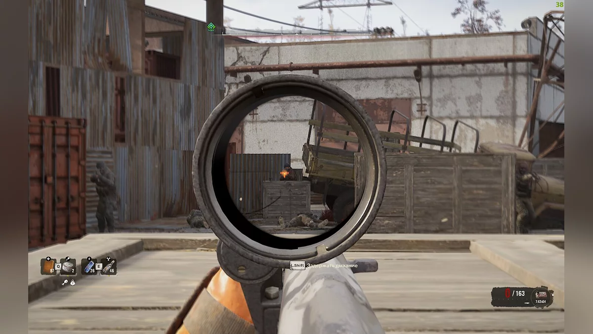 Теперь заберитесь по лестнице и выберитесь наружу, используя палки на красных контейнерах. Здесь единственной и верной тактикой будет сначала избавиться от бандитов около забора и занять позицию за деревянным ящикам. Используя снайперскую винтовку, ликвидируйте все цели, время от времени покидая укрытие, чтобы не погибнуть от вражеских гранат.