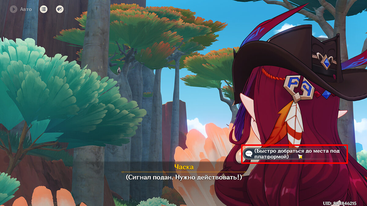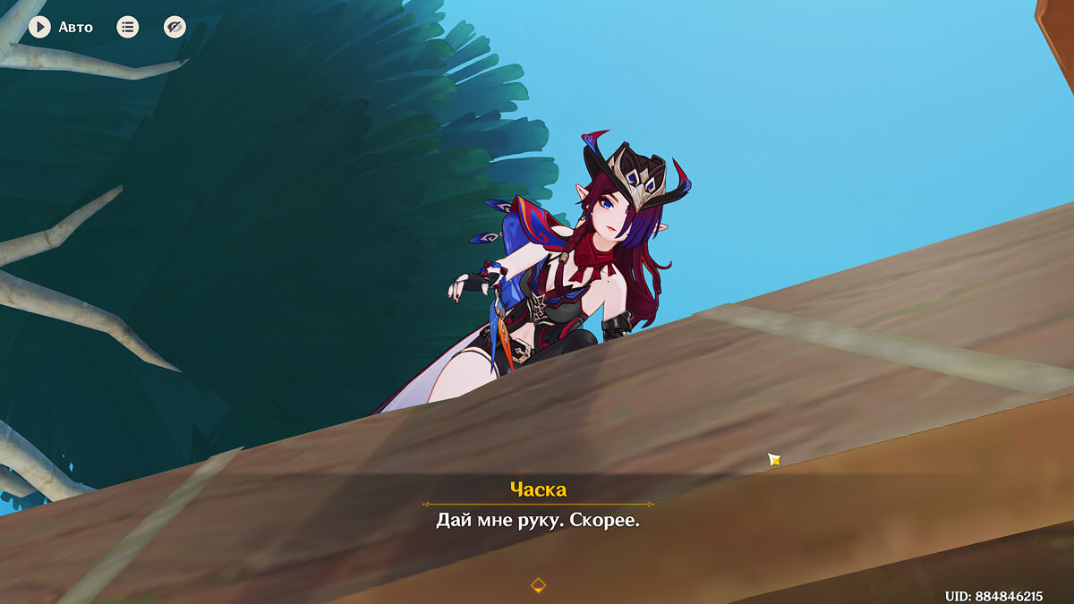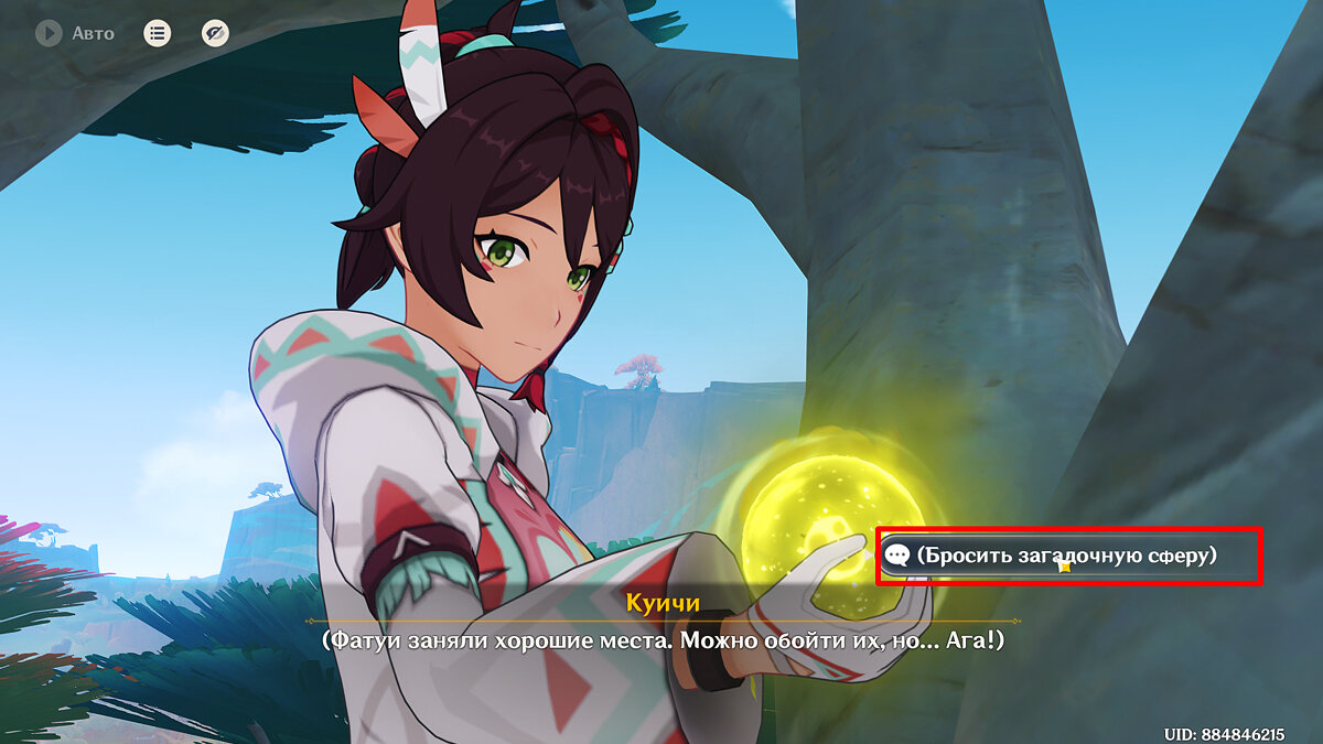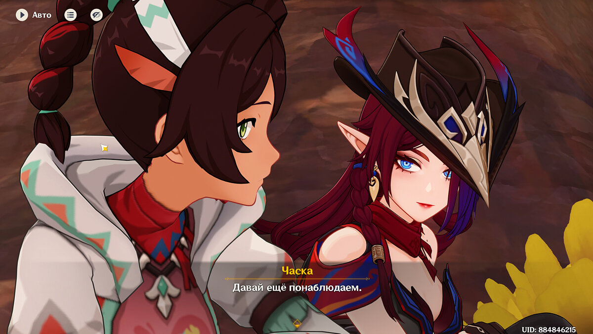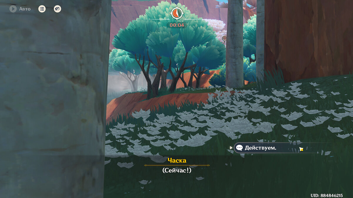 Часка и Куичи замечают, как Фатуи сражаются с монстрами Бездны, чтобы защитить натланцев. Они решают проследить за ними вместе, несмотря на небольшие разногласия. Далее Часке придётся несколько раз сделать действия после знака Куичи. В течении шести секунд успейте нажать: