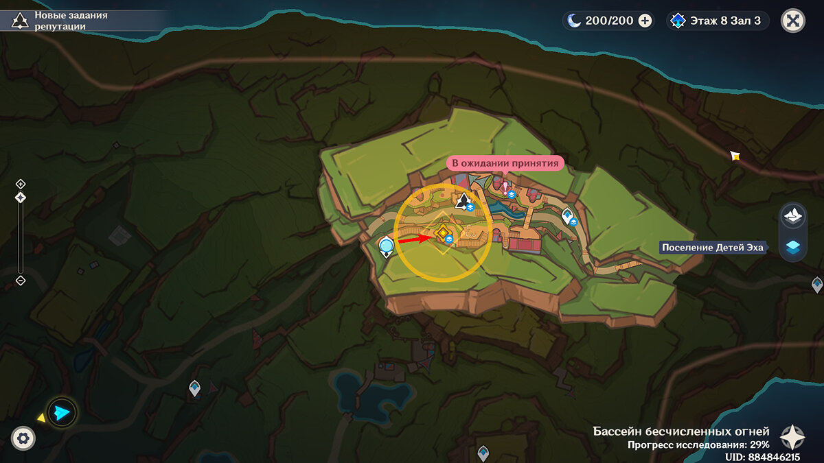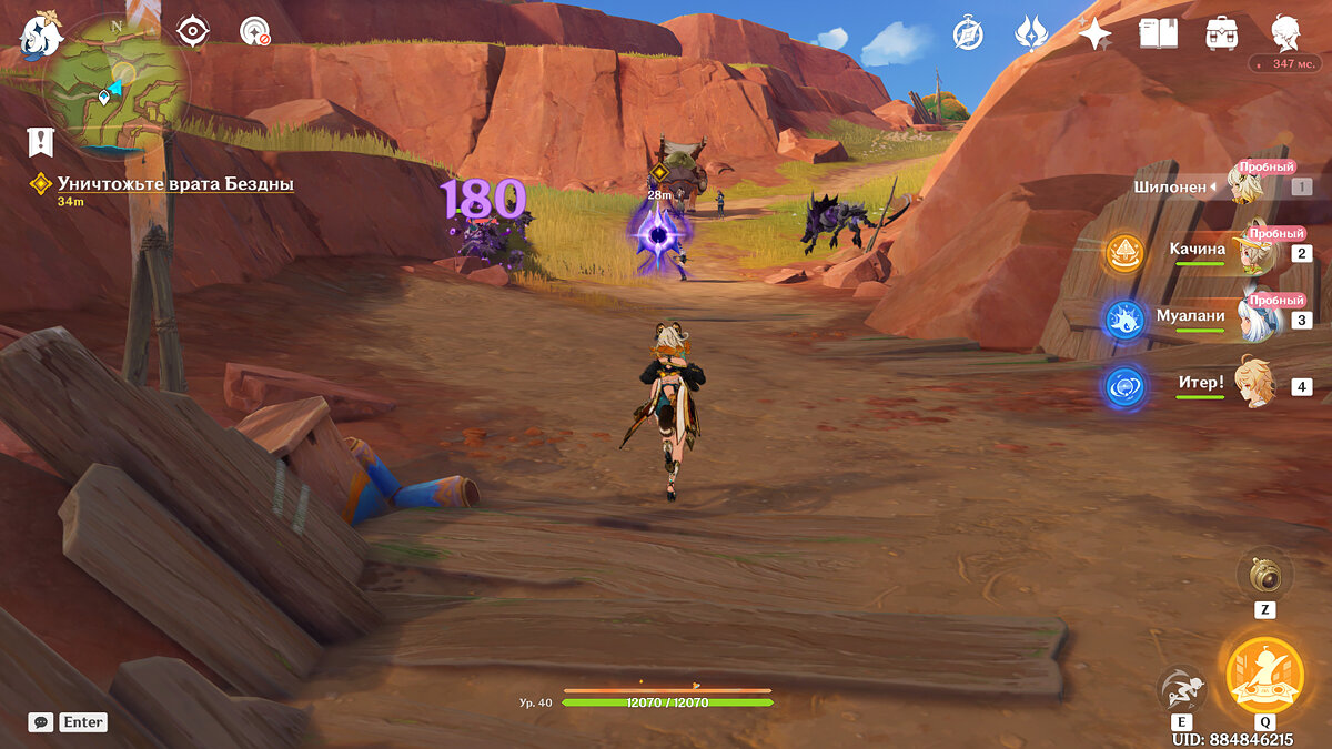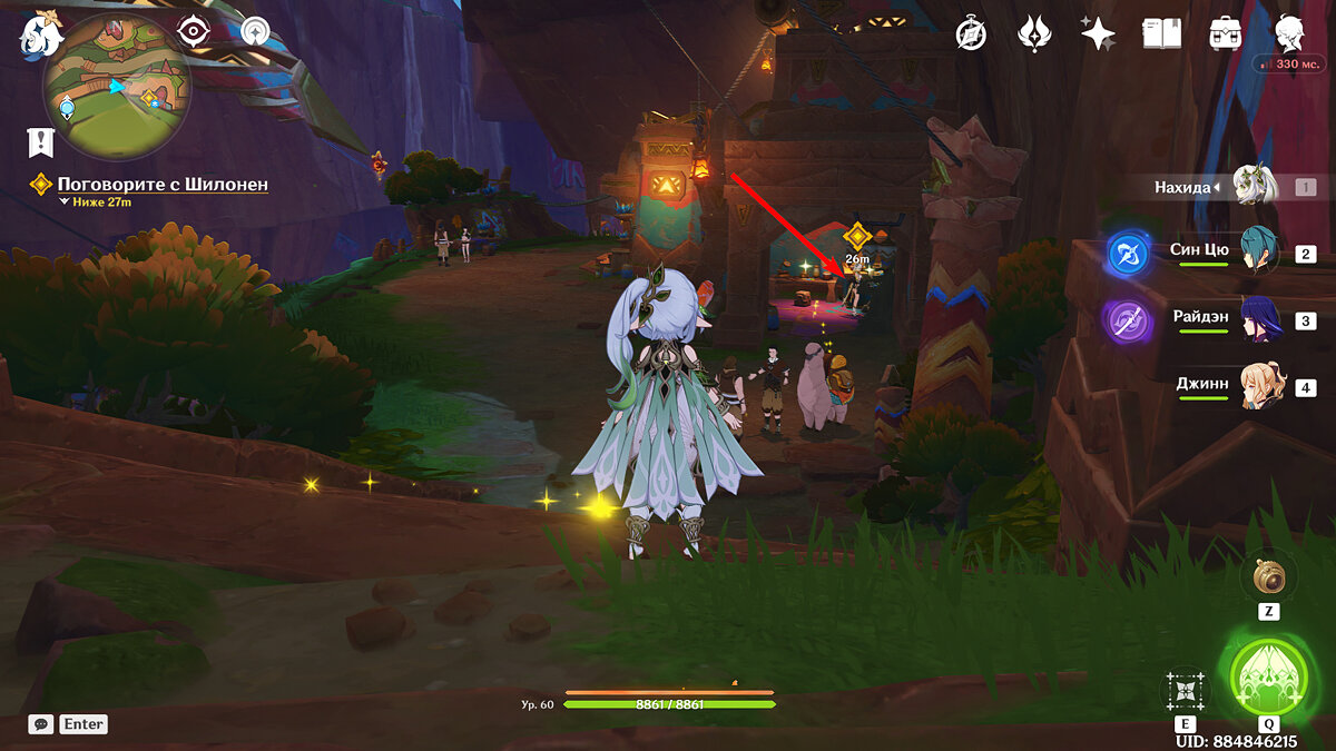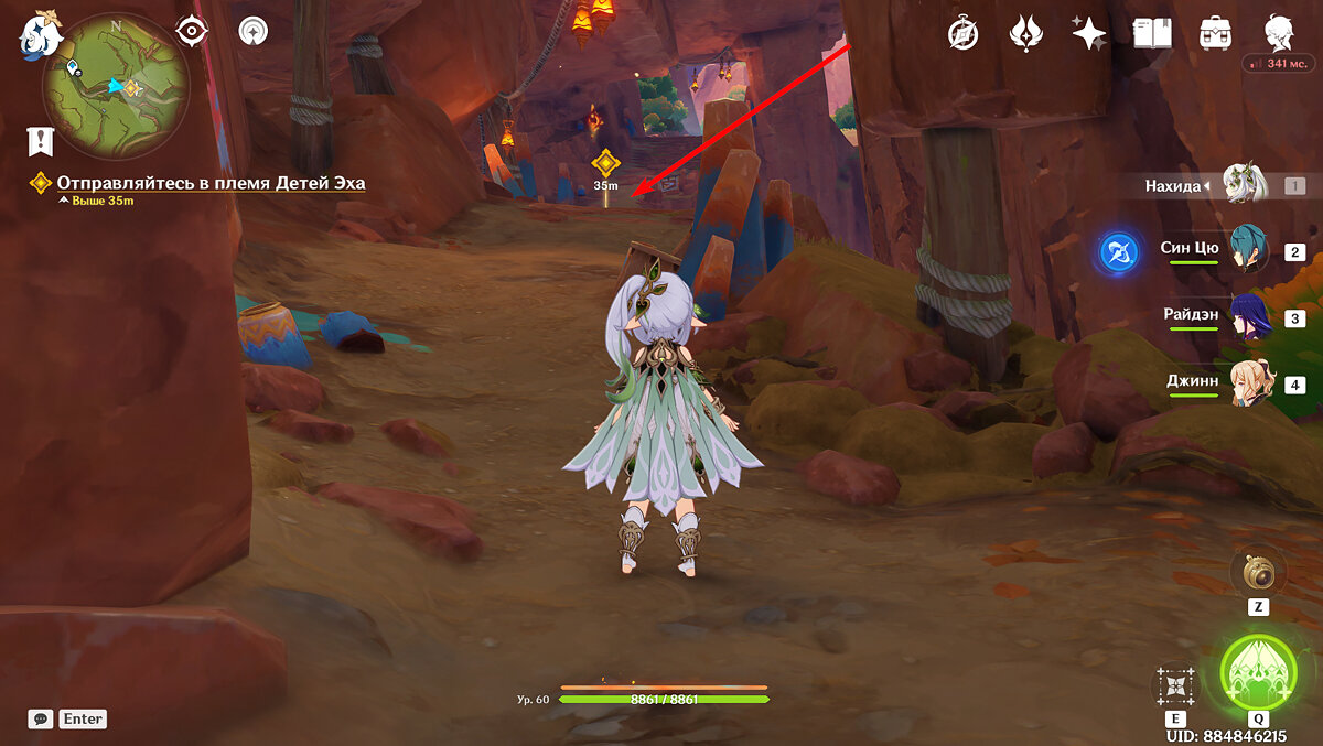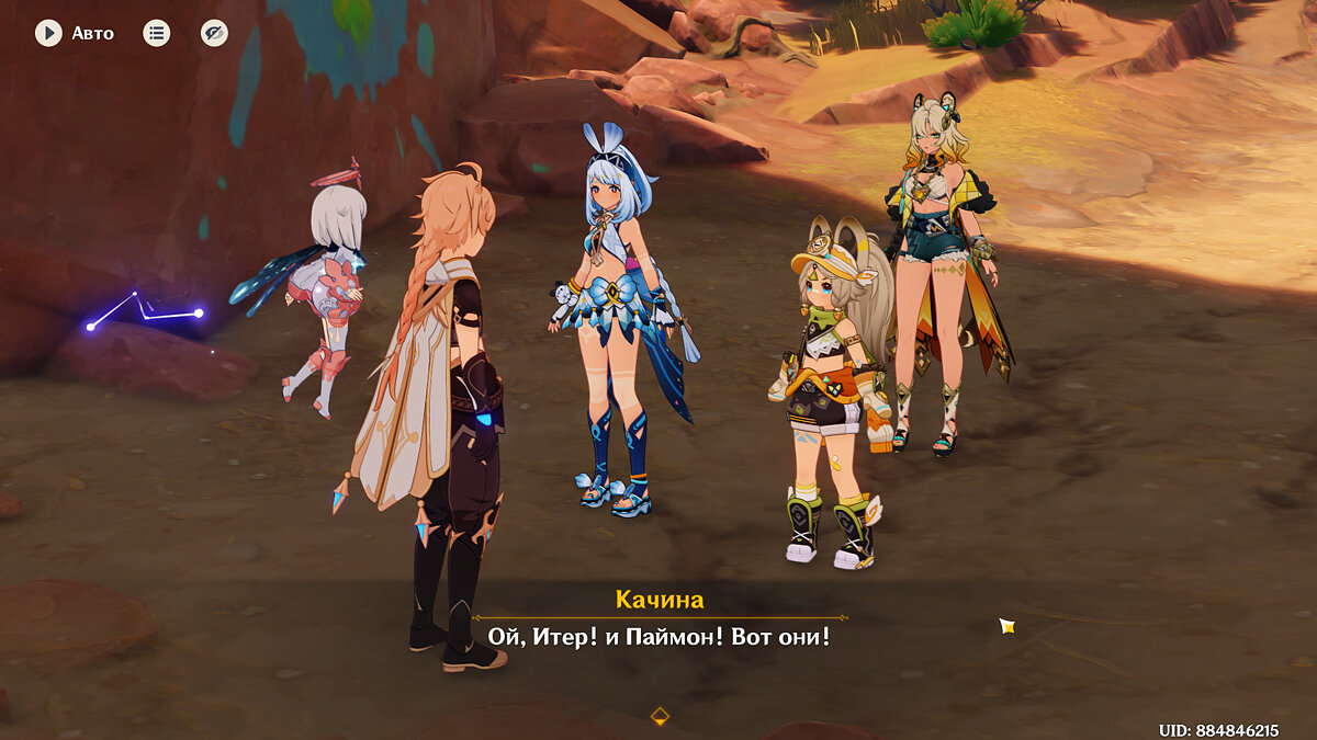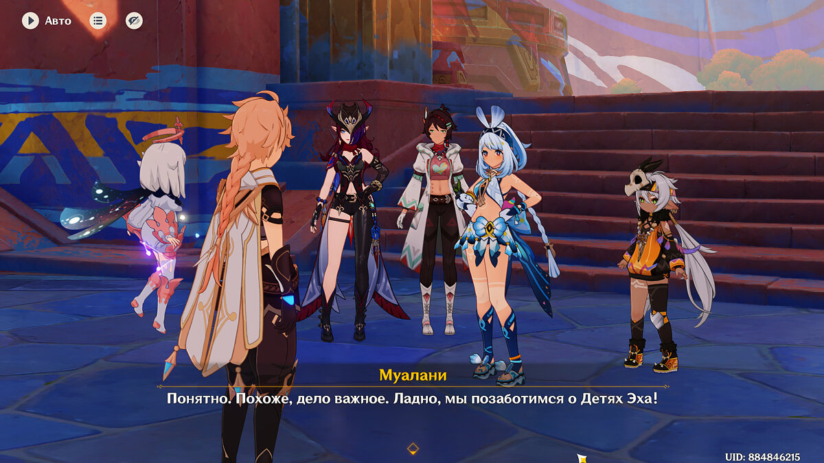 После диалога с Мавуикой отправляйтесь к Гео племени Натлана, Детям Эха, чтобы помочь отразить атаки Бездны. Воспользуйтесь телепортом в поселении и бегите в сторону востока по дорожке. Там вы встретитесь с Муалани, Качиной и Шилонен, которые спасают людей.