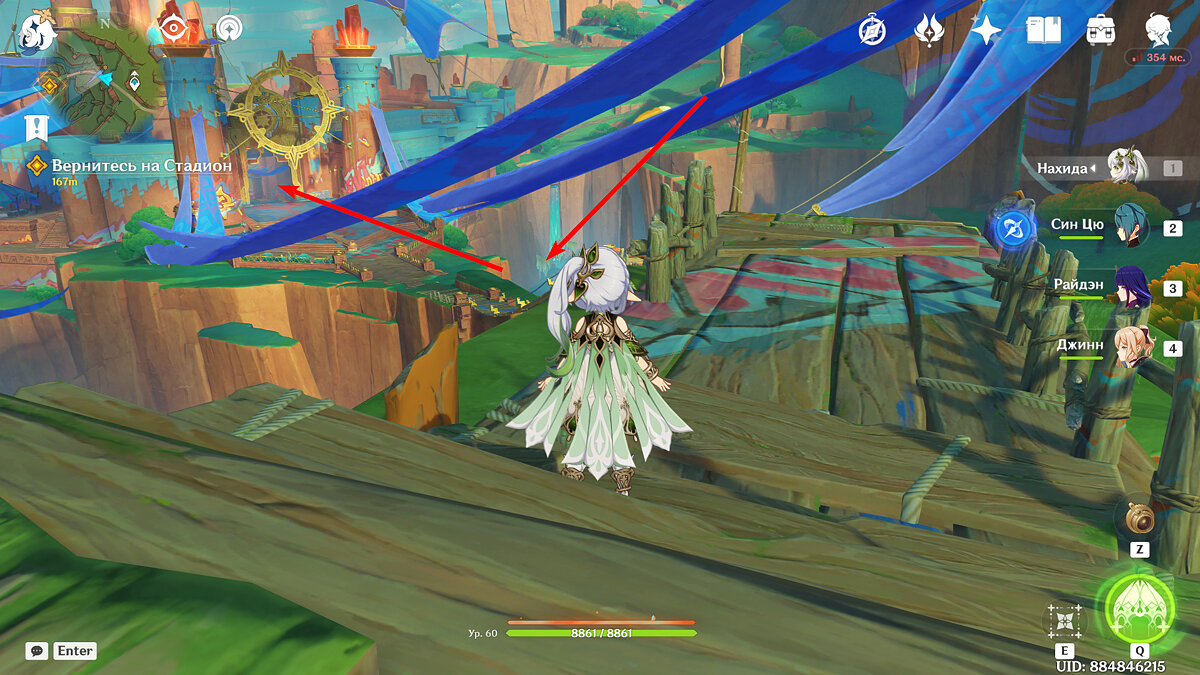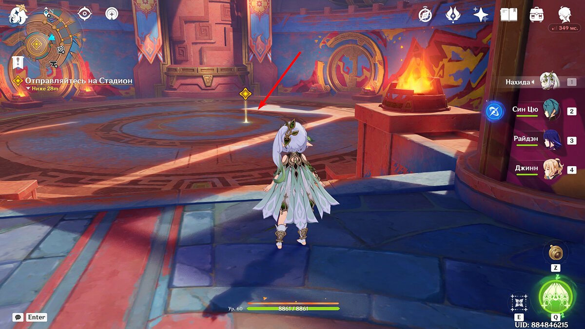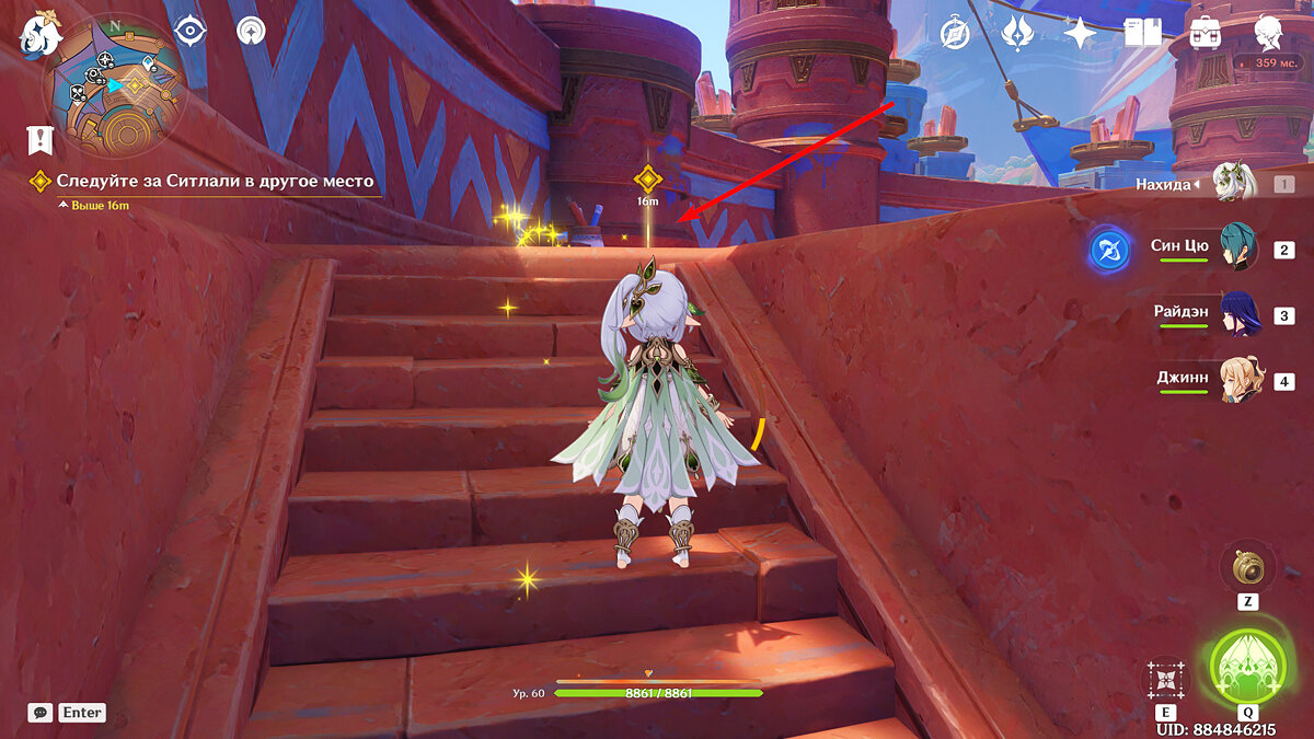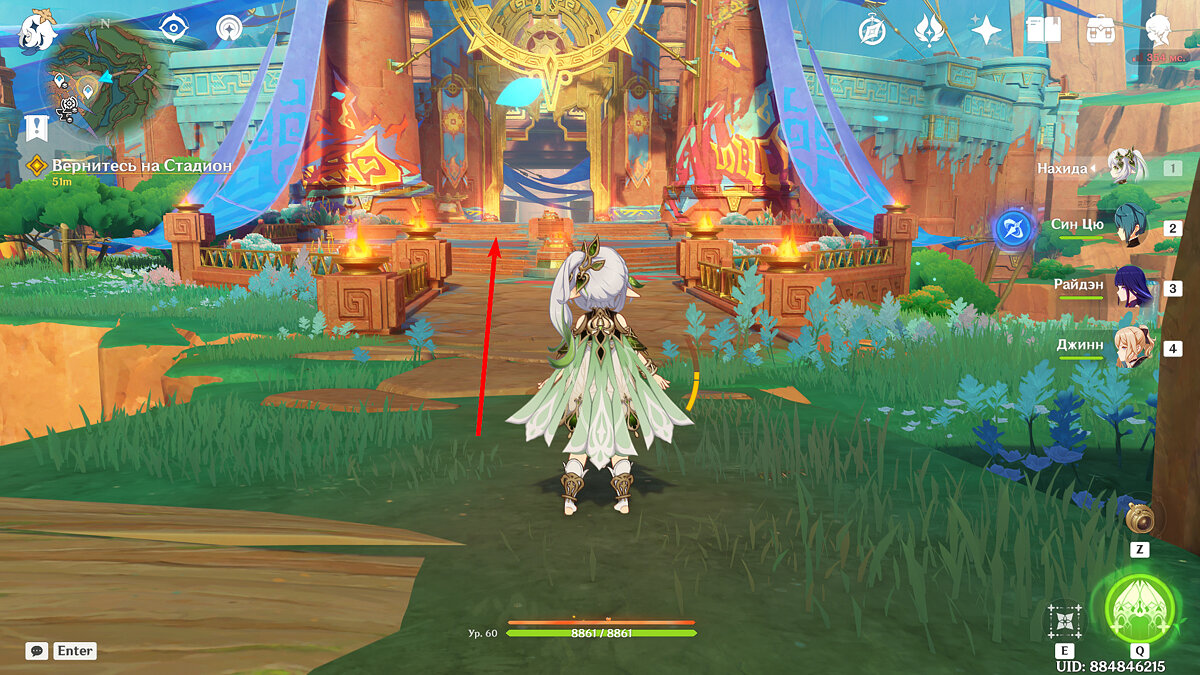 Следуя совету Шилонен, воспользуйтесь самой западной точкой перемещения на Стадионе священного пламени и пробегите немного юго-восточнее, к столам. Подождав достаточно много времени, Путешественник и Паймон всё же встречаются с запоздавшей Ситлали.