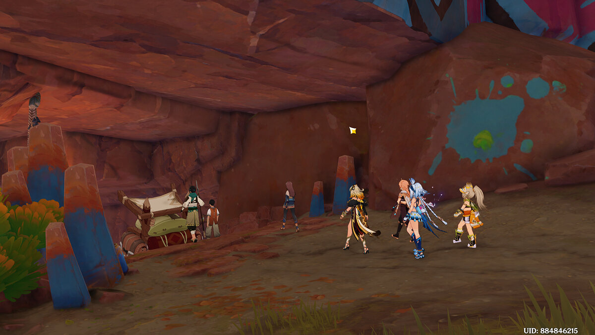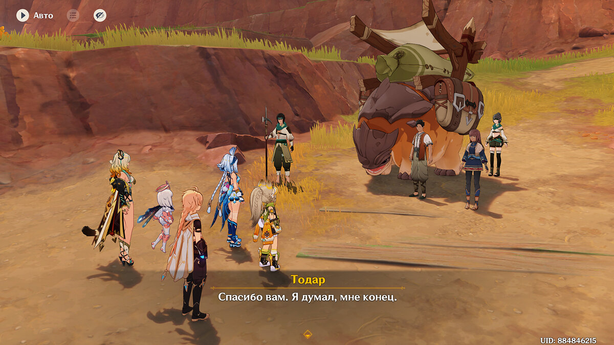 Они попросят Путешественника помочь каравану, на который напали монстры. Бегите по тропе в том же направлении, пока не наткнётесь на торговцев, которых окружили враги. Элементальными атаками персонажей разрушьте Врата Бездны и поговорите со спасёнными людьми.