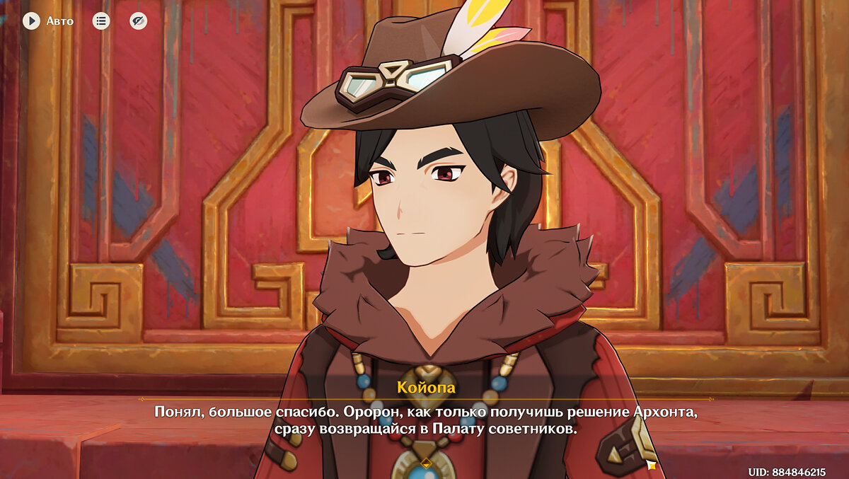 После того как Ситлали отругала Оророна и выяснила, что его не заставляли делать что-то серьёзное, все решают вернуться к Пиро Архонту и доказать невиновность юноши. Используйте телепорт на Стадионе священного пламени и войдите в Палату Советников. Поговорите с персонажем по имени Койопа и объясните ему всё произошедшее, после чего, когда натланцы уйдут, Путешественник объяснит Паймон причину своей отключки ранее и тайные мотивы Оророна, а также расскажет о предстоящей встрече с Капитано и его плане о том, как спасти Пиро регион.