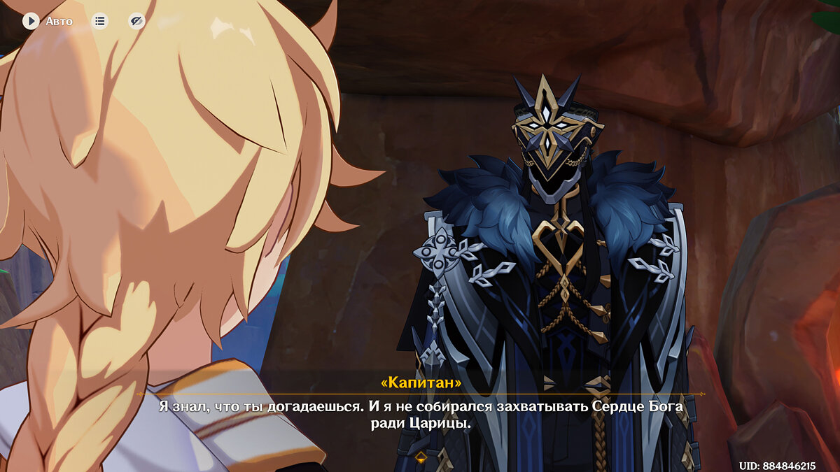 Оказывается, предвестник не заинтересован в сражении с Путешественником, как большинство из Фатуи. Он, наоборот, хочет спасти Натлан от сил бездны, поэтому временно оставил охоту на гнозис. Однако, Капитано считает что Мавуика не справляется со своей задачей: ждать героев очень долго, а угроза уничтожения целой страны нарастает с каждым днём. Увы, полностью рассказать о своём плане Капитано не удаётся: их разговор прерывает Ситлали, которая всё это время следила за Оророном. Вместе вы решаете вернуться на Стадион.