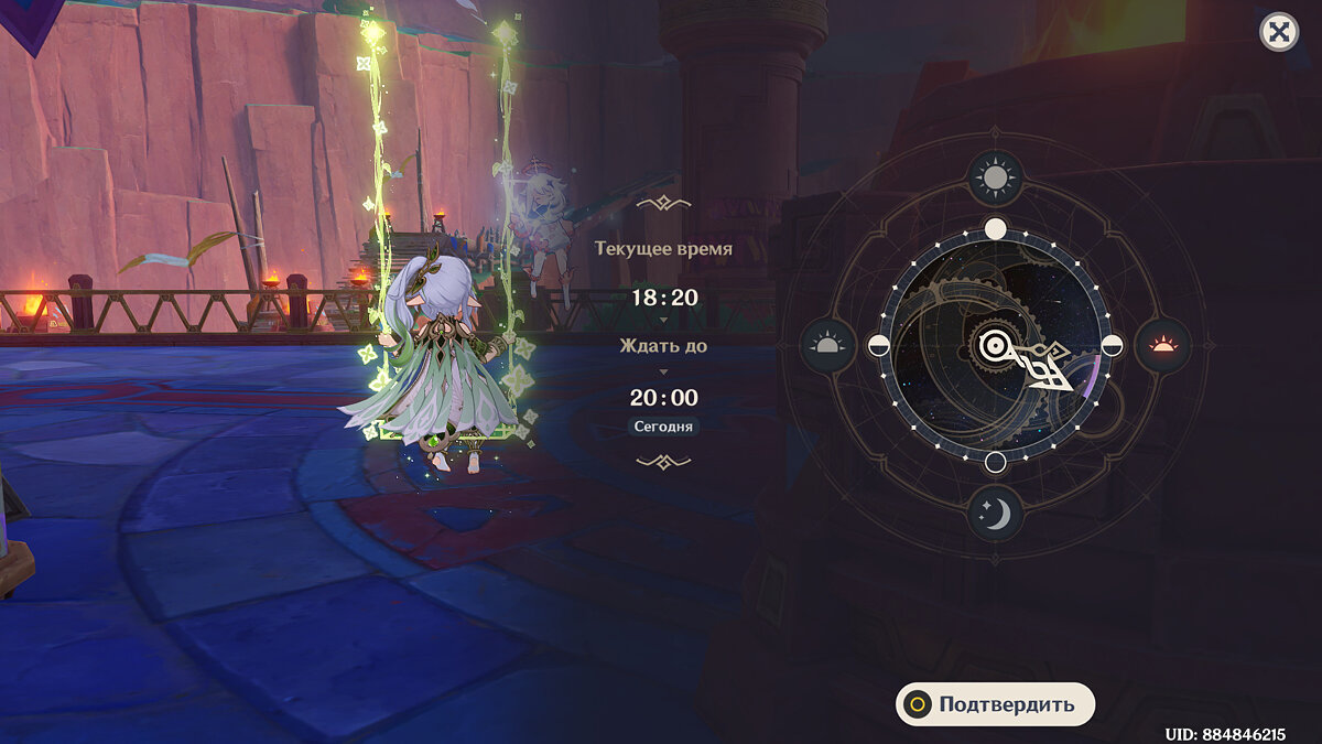 Дождитесь 20:00 следующего дня, чтобы пойти на встречу с первым предвестником Фатуи. Для этого промотайте на часах до определённого времени и отправляйтесь к нужному месту. Оно будет находиться на востоке от стадиона, чуть севернее Статуи Архонта. Телепортируйтесь к монументу и бегите к прямоугольному камню с оберегами. Поговорите там с Оророном и Капитано, чтобы выяснить их план по спасению Натлана.