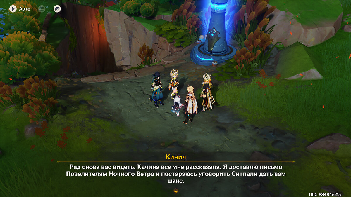 Телепортируйтесь обратно к Статуе Архонта и встретьтесь там с Киничем. Отдайте ему письмо и разработайте план, как уговорить Ситлали работать над созданием древнего имени. Кроме того, охотник из племени «Потомки крон» даст ценную информацию о том, кто из натланцев помогает предвестнику Фатуи Капитано. Отдайте юноше письмо и договоритесь о встрече через два дня.