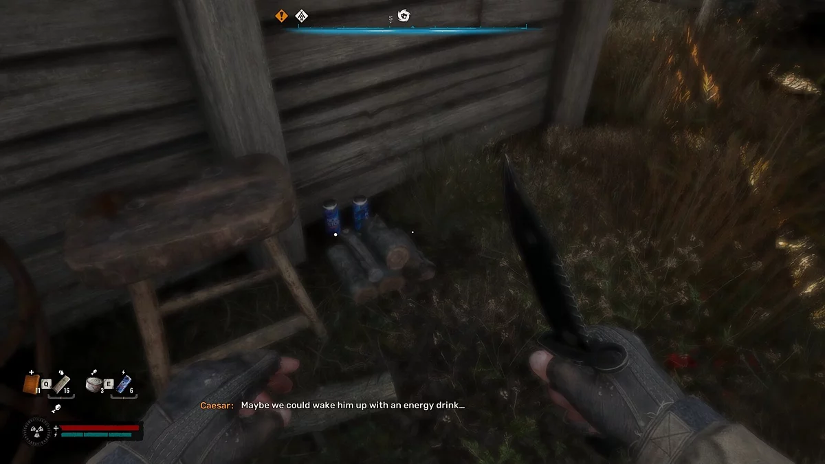 С противоположной стороны есть первое здание. Заходите внутрь и исследуйте труп справа от входа. Если обернуться и пройти немного вперёд, слева вы увидите две банки энергетика — как раз сейчас это очень полезная находка.