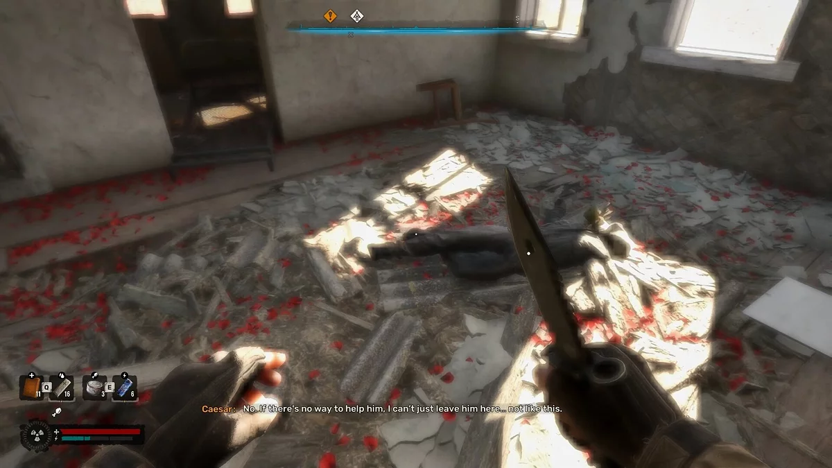 Теперь вернитесь к дороге и изучите остатки то ли сарая, то ли колодца. Рядом тоже будет труп, у которого можно позаимствовать патроны и почти сломанное оружие.