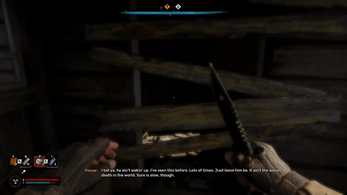 От дома Помора двигайтесь по дороге вперёд. Справа от вас будет одинокое дерево — подойдите и осмотрите труп. Много ценностей вы не найдёте, однако рядом с каждым погибшим здесь человеком можно услышать немного предыстории его кончины.