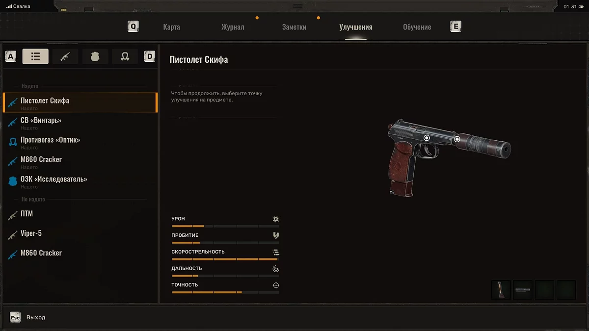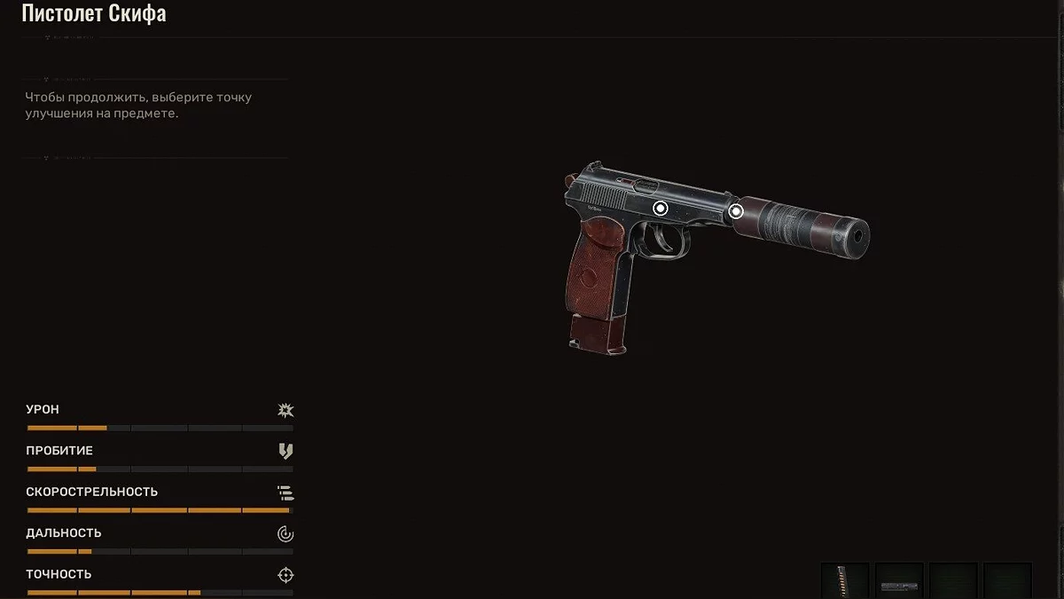 Альтернатива: АПСБ. Хороший пистолет, который можно держать при себе на случай, если надоест пистолет Скифа. Бесшумный, с хорошим показателем пробивания брони и приятной дальностью полета пули. Особо тратиться на прокачку не советуем, но один экземпляр всегда храните в ящике. Вдруг вам захочется разнообразия.