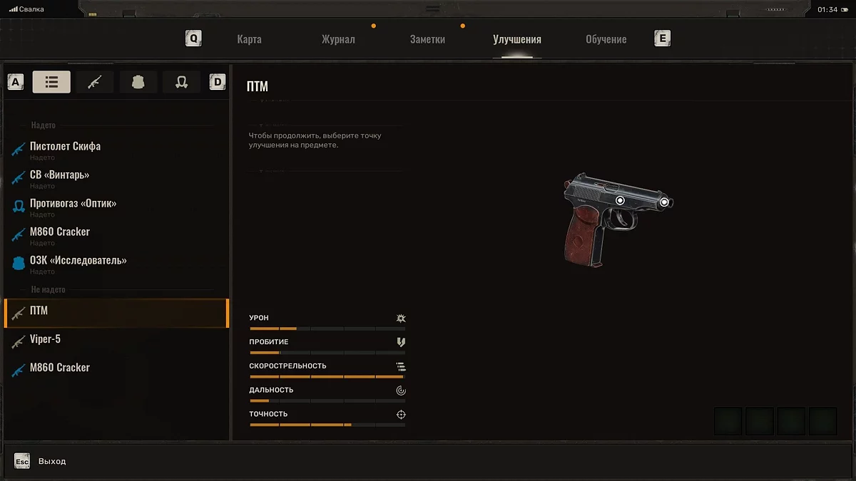 ПТМ — один из самых распространенных пистолетов в игре. Он есть в наличии у большинства сталкеров или бандитов. Пушка часто попадается в тайниках или может просто лежать на локации. Несмотря на то что пистолет может похвастаться приличным уроном и весьма скромным весом, нет особых причин таскать его с собой и тем более улучшать.