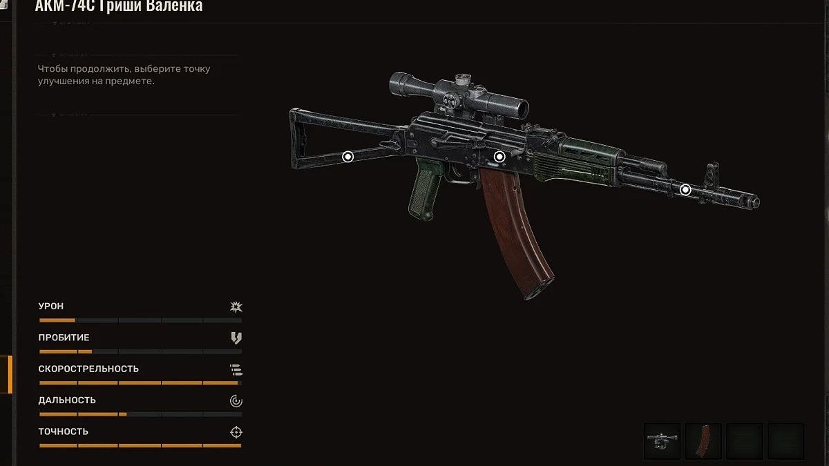 Улучшенная версия классического AKС-74C. Идеальный автомат для первых вылазок в зону отчуждения. Вы сможете забрать его из схрона на водонапорной башне. Возьмите квест на выбивание долгов у бармена в «Залесье». Во время выполнения поговорите с Валенком, чтобы получить координаты тайника.