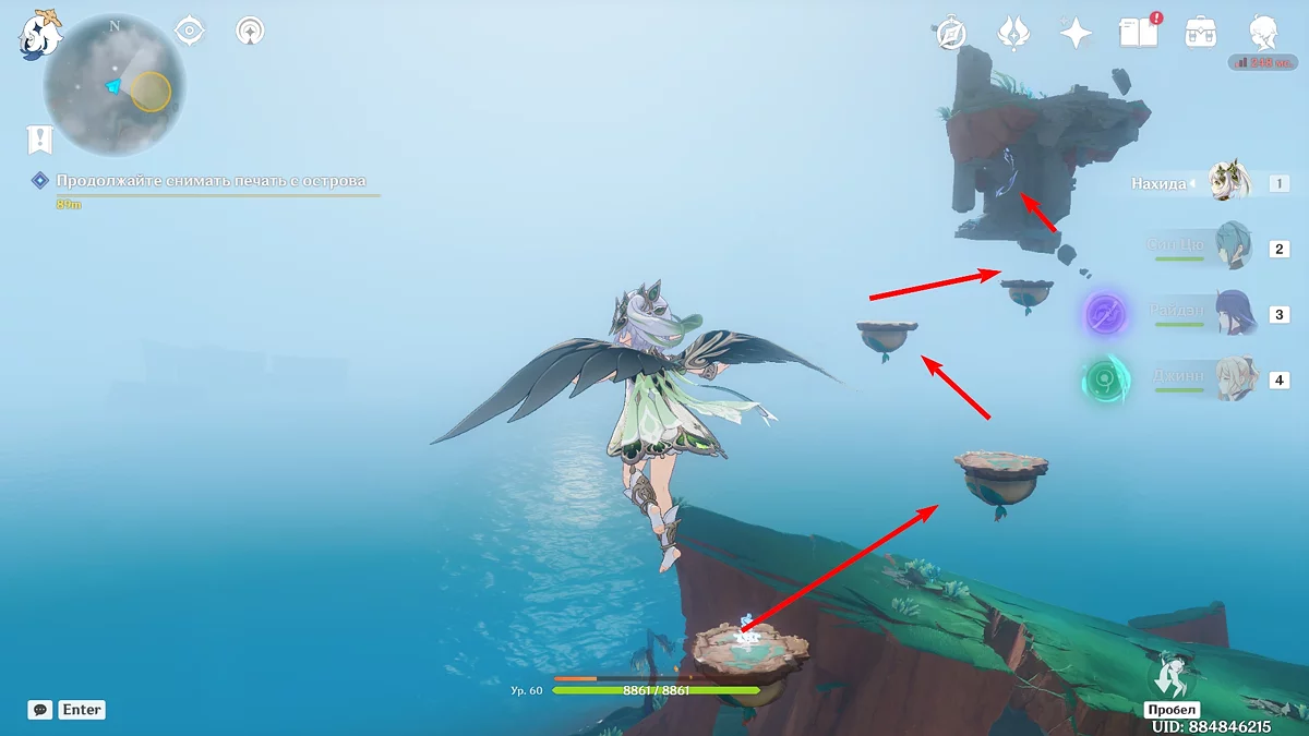 Разделайтесь с появившимися врагами и прыгайте ещё на уровень вниз. Там будет третья печать. Как и до этого, активируйте её способностью иктомизавра, после чего взлетите на появившемся потоке ветра на самый верх. Откройте точку телепорта на острове и заберите богатый сундук.