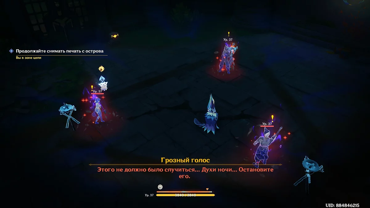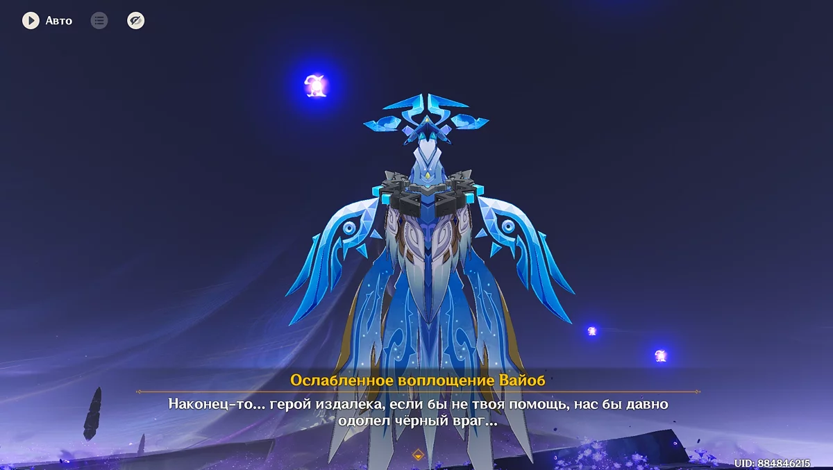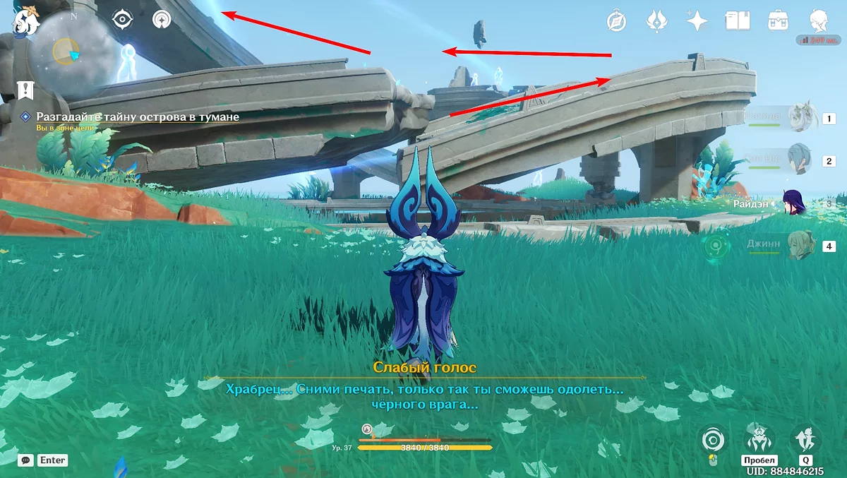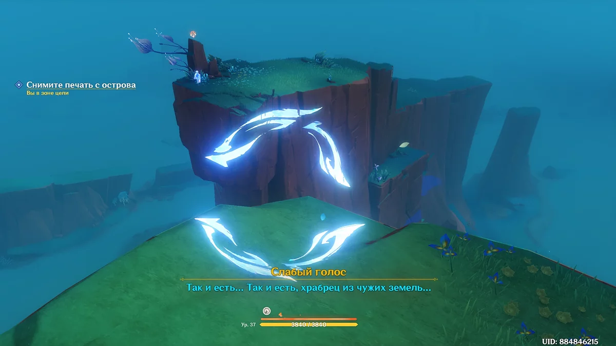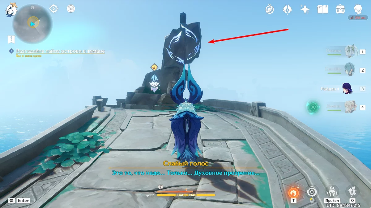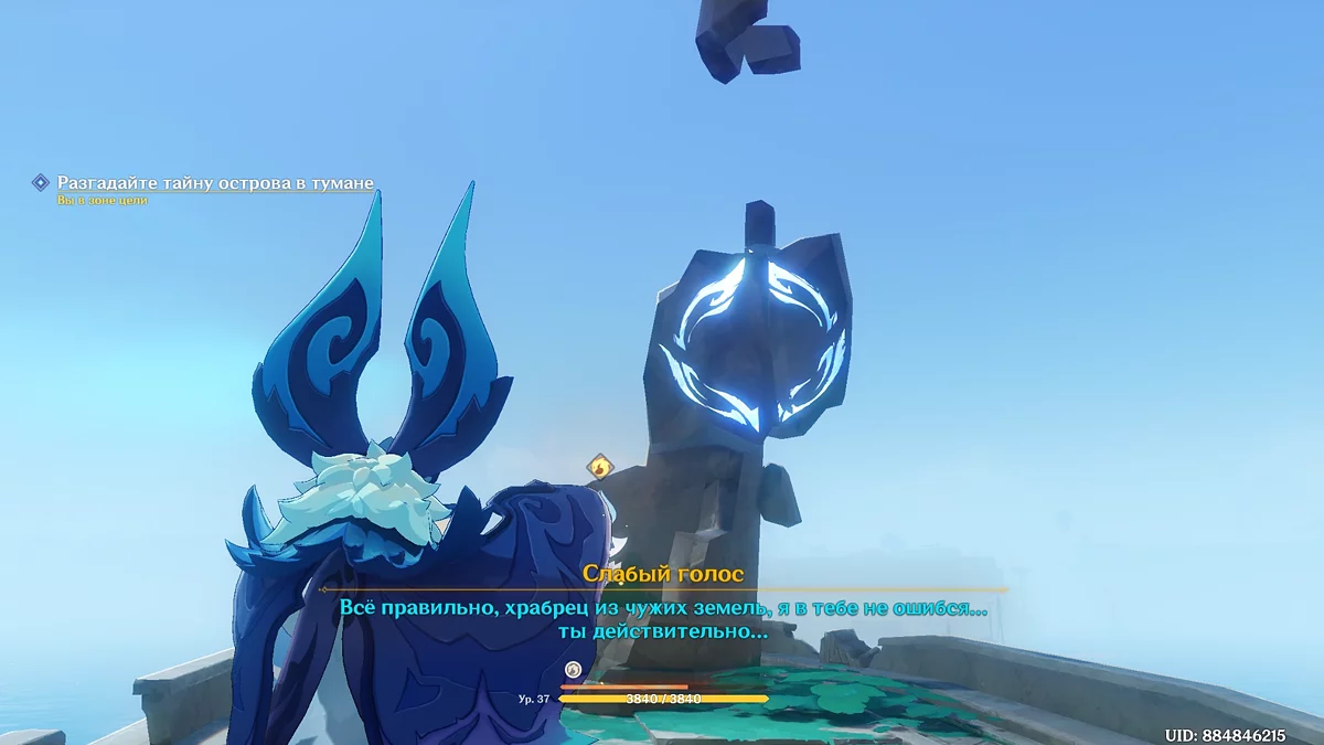 Одолейте враждебное воплощение Вайоб: лучше всего для этого подойдут Пиро и Электро персонажи, ведь сам противник Крио стихии. После успешной победы поговорите с другим духом — тем самым добрым голосом, который помогал Путешественнику. После диалога туман над островом рассеется.