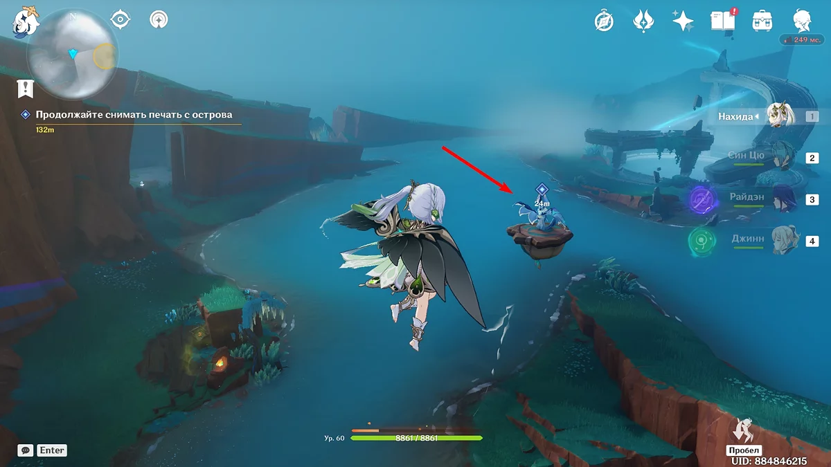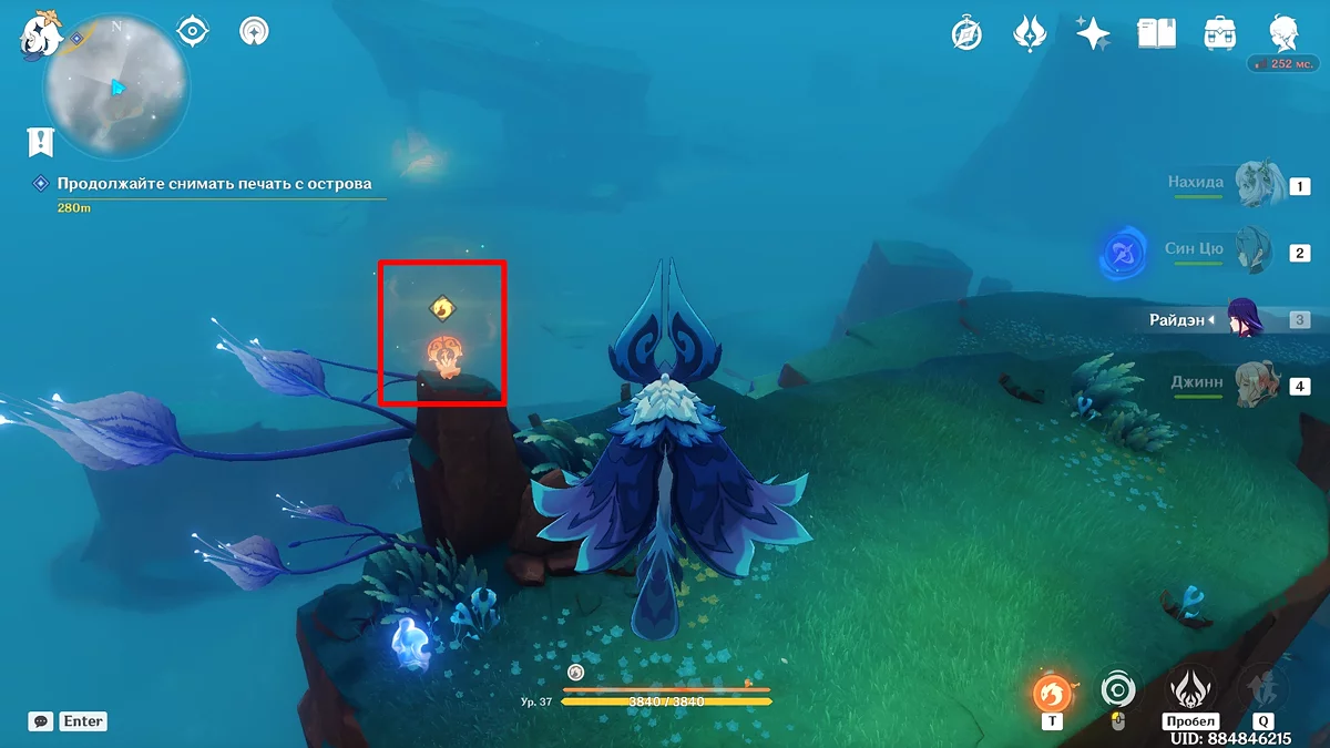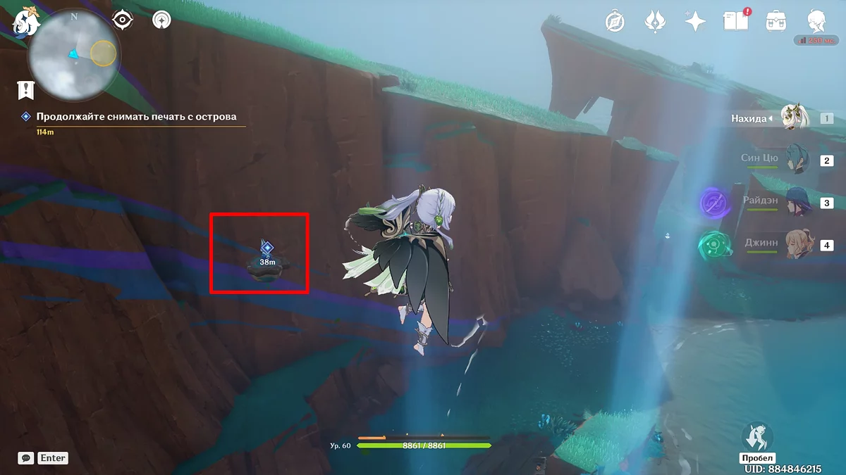 Вернитесь к механизму в центре острова, на котором была снята первая печать. Просто пикируйте с парящей руины к светящемуся устройству, чтобы не пересекать большое расстояние вплавь.