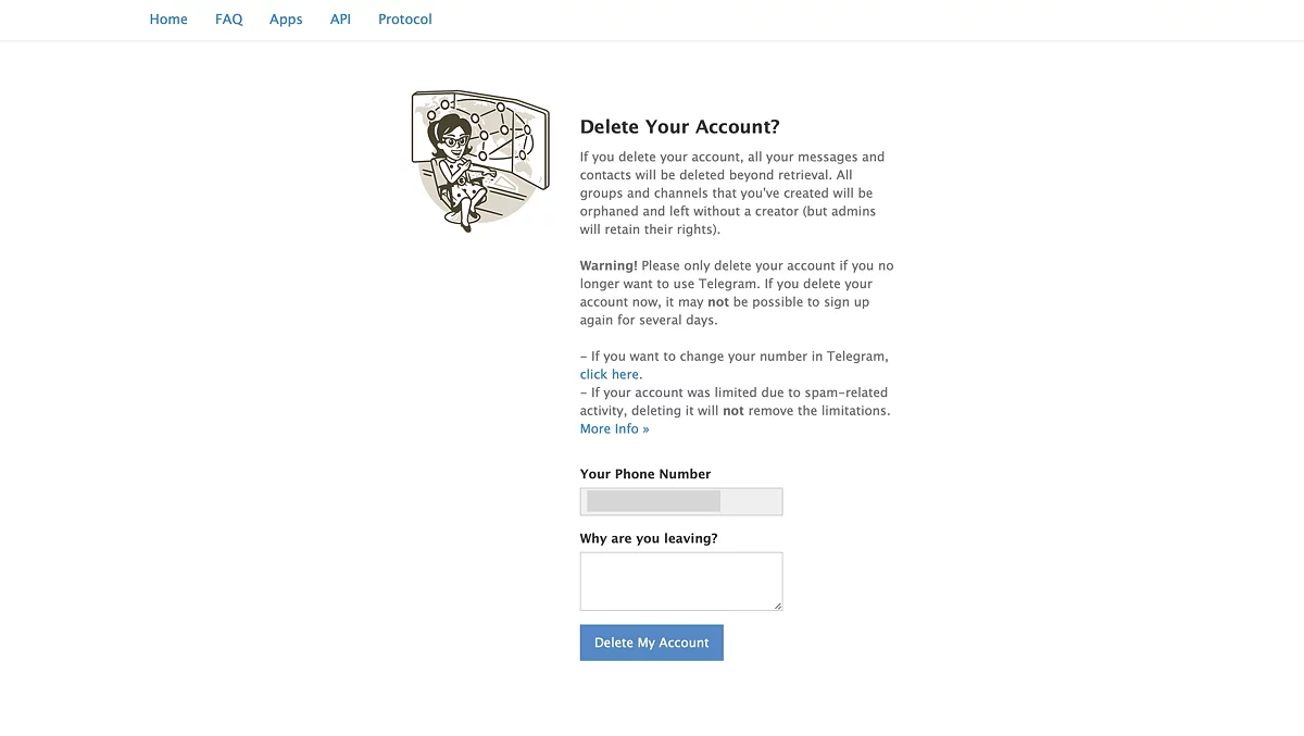 На iOS процесс немного отличается: сначала зайдите в настройки Telegram и найдите раздел «Помощь», затем выберите «Telegram FAQ». Прокрутите страницу вверх и найдите вопрос, связанный с удалением профиля. В ответе нажмите на выделенные слова «удаление аккаунта», и нужная страница откроется в браузере.