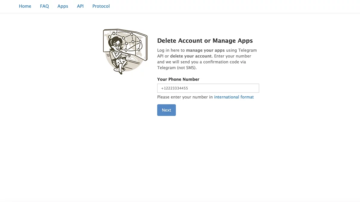 Введите номер телефона, привязанного к удаляемому профилю, чтобы авторизоваться. Вам придет специальный код в самом Telegram, который нужно ввести в появившемся поле. Обратите внимание, что ни в коем случае не следует его сообщать кому-либо: используйте код самостоятельно. Далее нажмите кнопку «Войти».