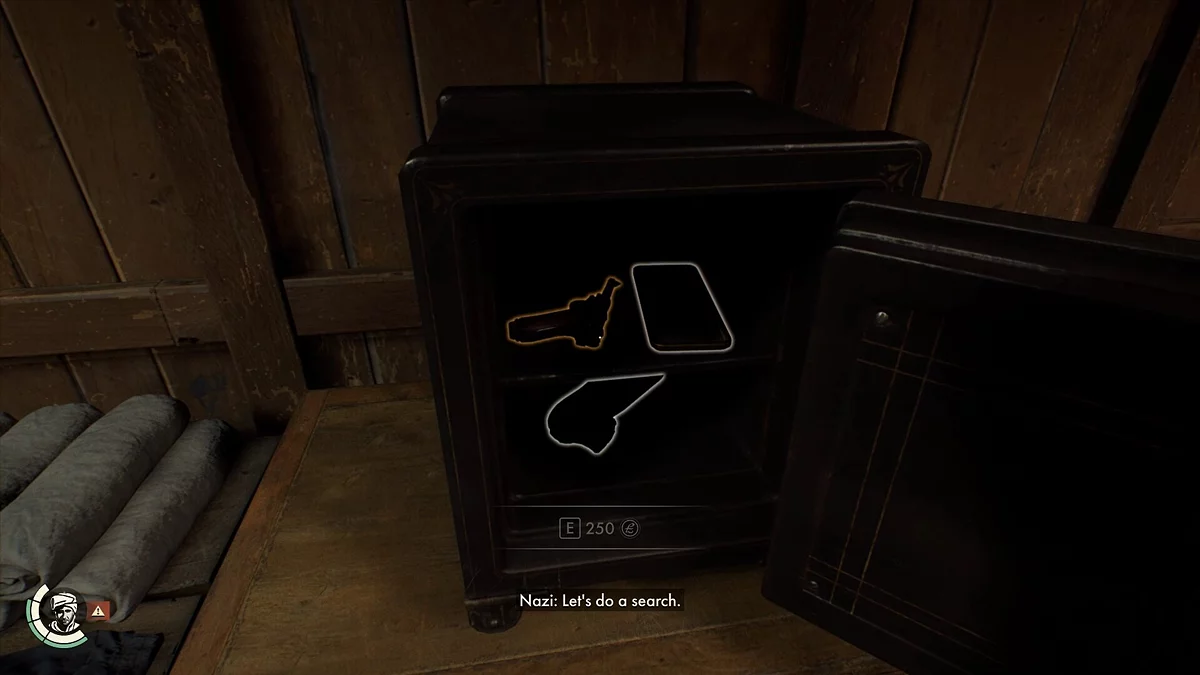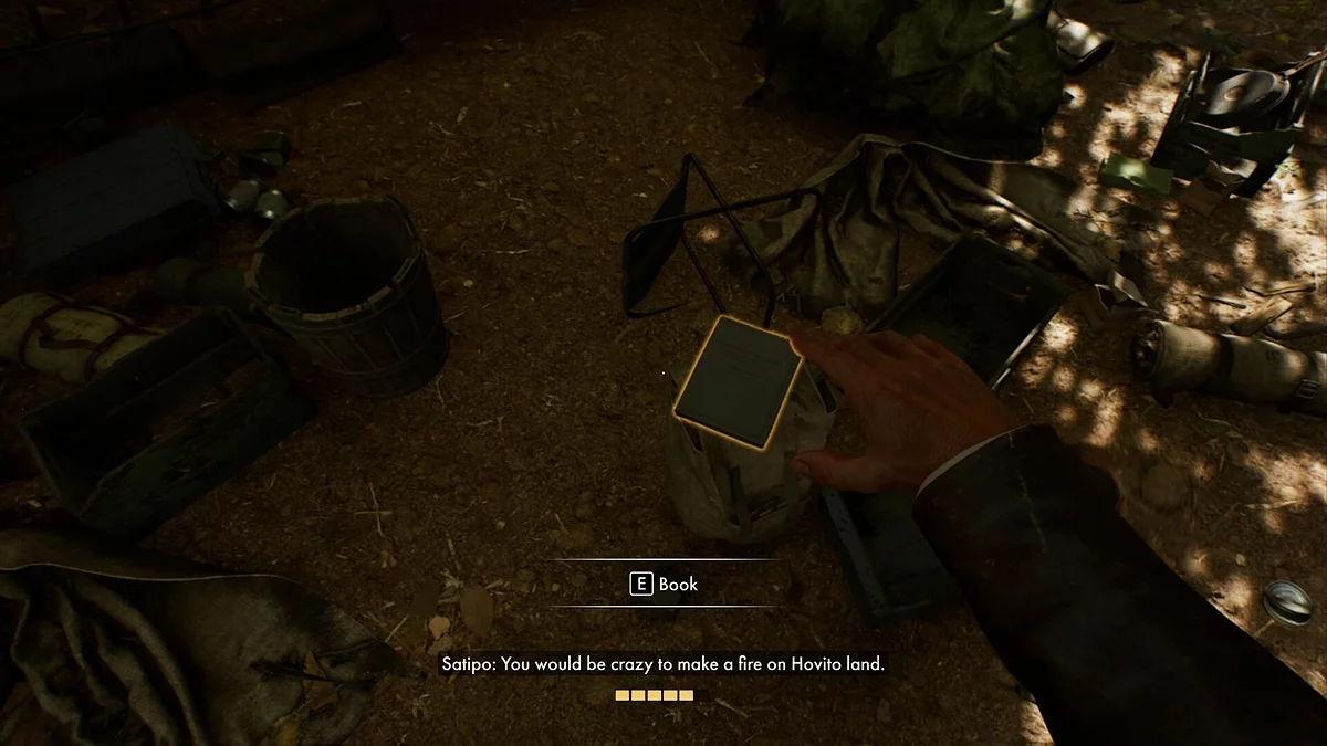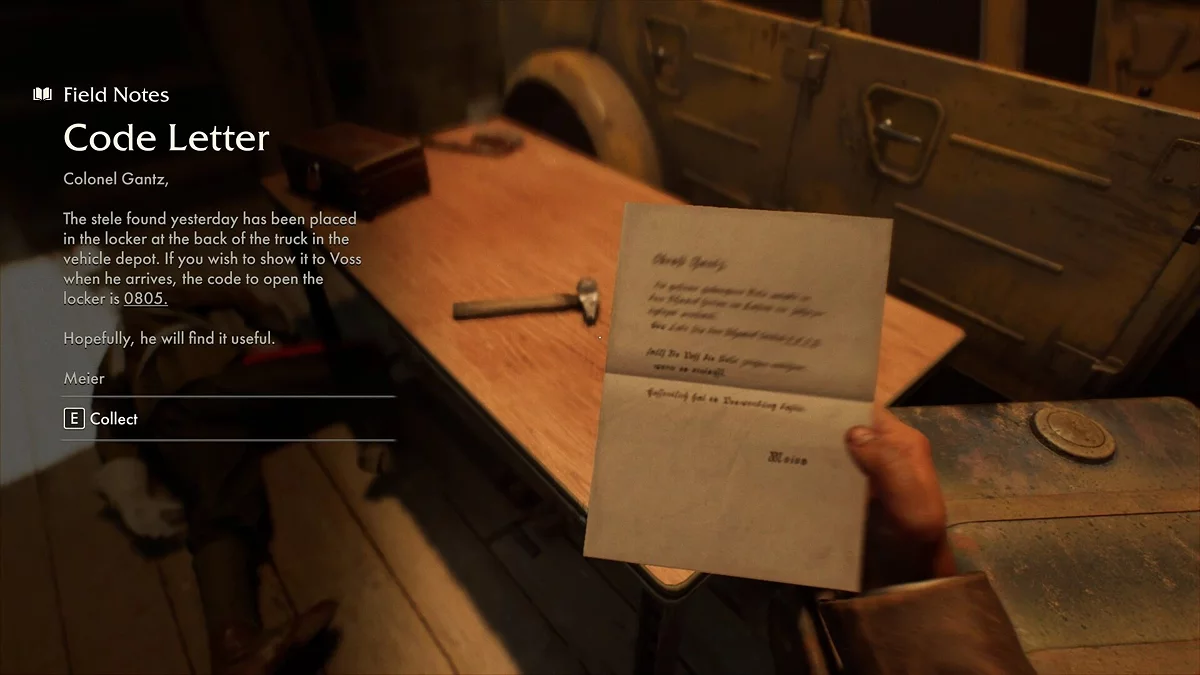 В первой военной палатке заберите деньги, отчет о краже (Theft Report) и билет в выдвижном ящике стола. На билете есть комбинация — она подойдёт для запертого чемодана рядом (5238). Внутри будут деньги и книга (Splinter Smash).