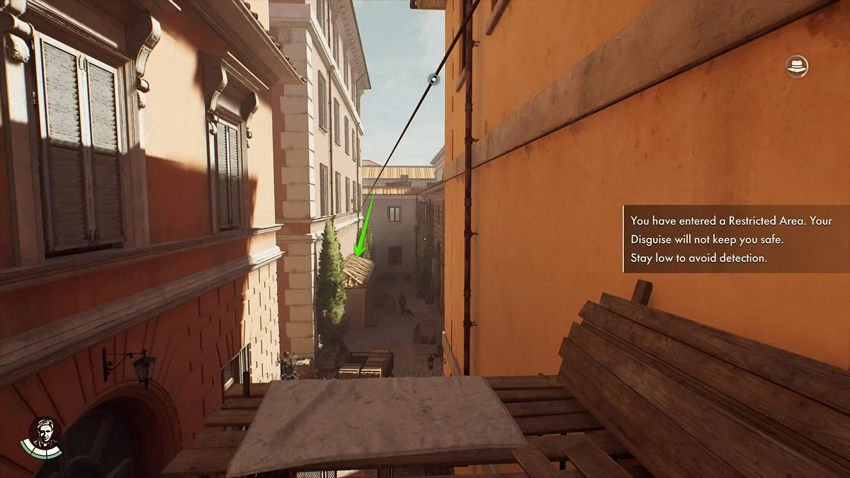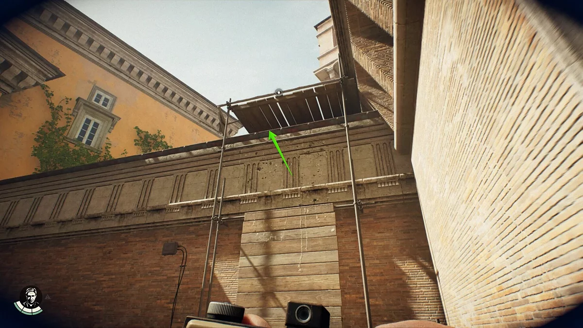 Первого охранника можно игнорировать, так как он не успеет добраться до вас, если вы быстро пробежите к освещенной пристройке и запрыгните на крышу. Но в этом случае он может поднять тревогу, так что решать вам.