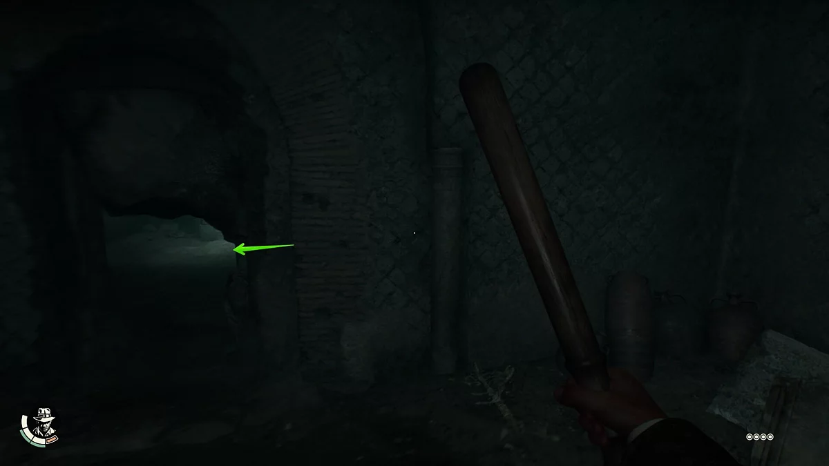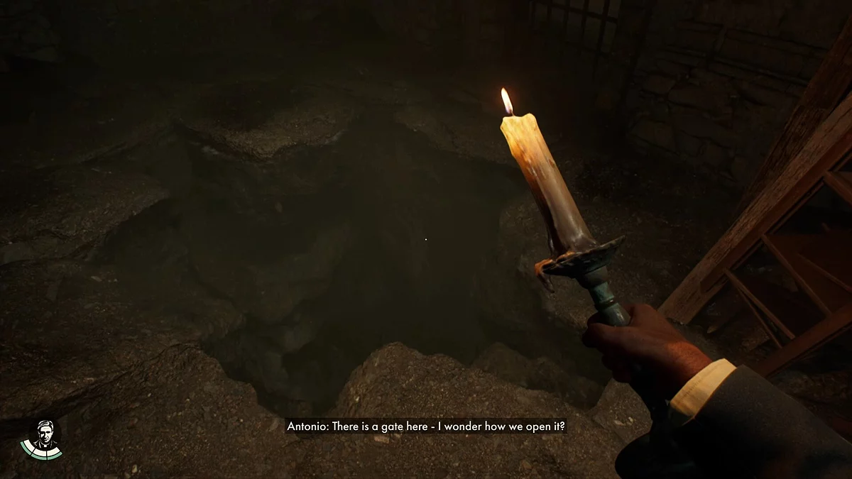 Нас интересует дверь, у которой стоит электрик. Подойдите к странному символу на стене и используйте амулет гиганта, чтобы открыть проход. Позади вас появится Антонио. Пройдите немного вперёд и осмотрите темноту. Затем вернитесь и заберите свечу со стола.