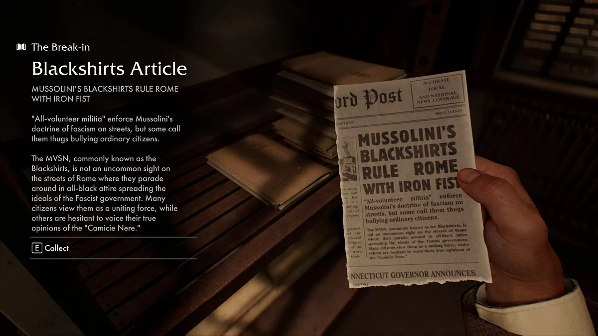 Из музея идите в коридор слева, затем заходите в первую дверь слева. Здесь на полке вы найдёте газетную вырезку (Blackshirts Article).