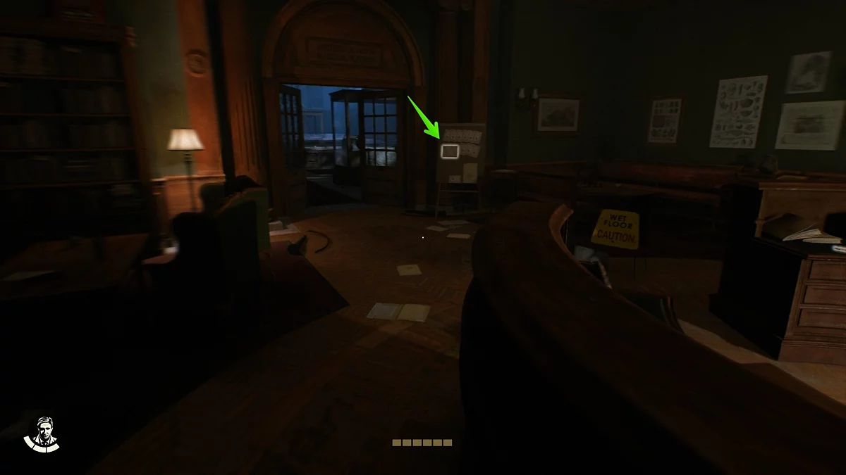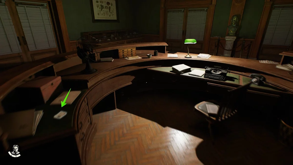 Идите вперёд до лестницы на второй этаж, затем спускайтесь в основной зал музея. Сейчас исследовать комнаты и коридоры нет смысла, поскольку интерактивных предметов не будет, кроме карты колледжа. Она находится в приёмной на первом этаже. Здесь же на столе можете подобрать бейдж — если пропустили, можете сделать это позже.