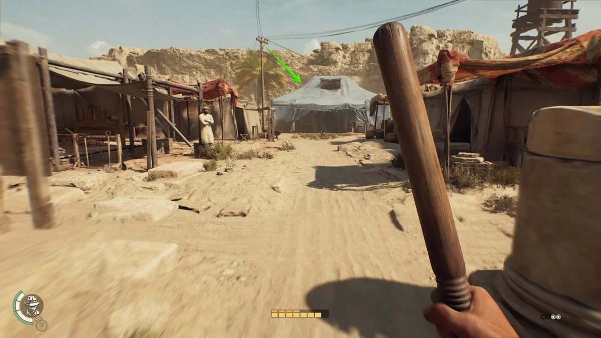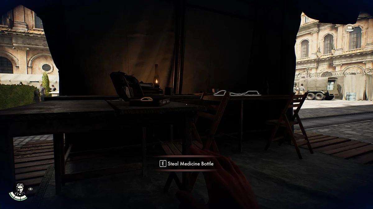 Чтобы украсть деньги и медикаменты (понадобятся для завершения побочного квеста) из соседней палатки, придётся отвлечь постового в небольшой будке. Для этого достаточно бросить бутылку позади него.