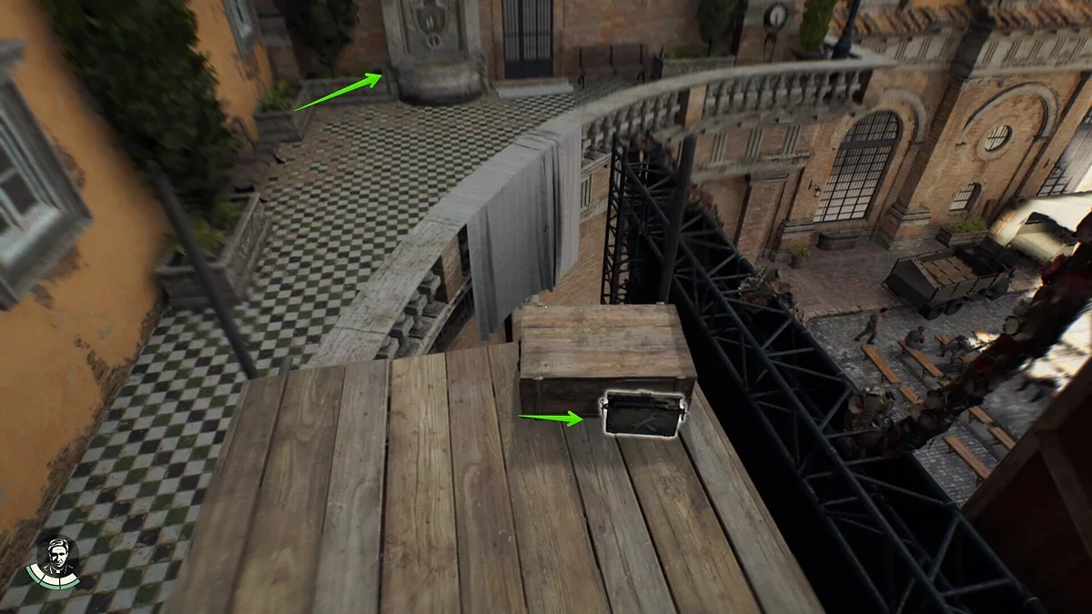Но сейчас выбирайтесь из противоположного окна на леса и на крыше справа найдите следующий постамент, который нужно сфотографировать.