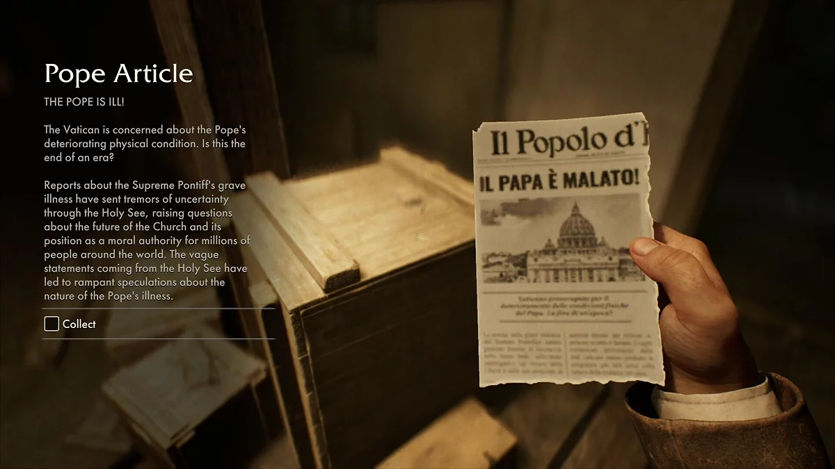 На крыше используйте кнут и вырубите двух врагов. В небольшом помещении на деревянном ящике заберите Новостную статью (Pope Article).