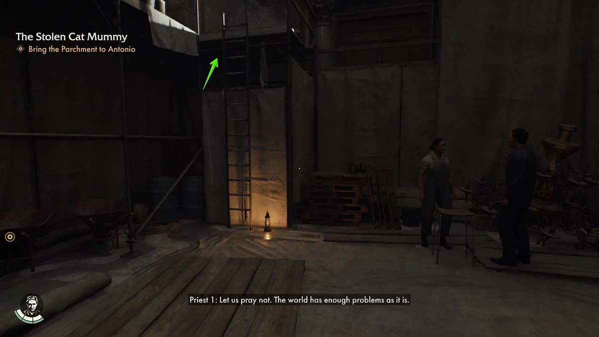 После продолжительной катсцены вы получите одежду священника, а задание изменится. Выбрать новый наряд можно из меню инвентаря. Переоденьтесь и спуститесь на первый этаж библиотеки. На дальнем столе с двумя священниками можно отыскать заметку (Briscola Flyer).