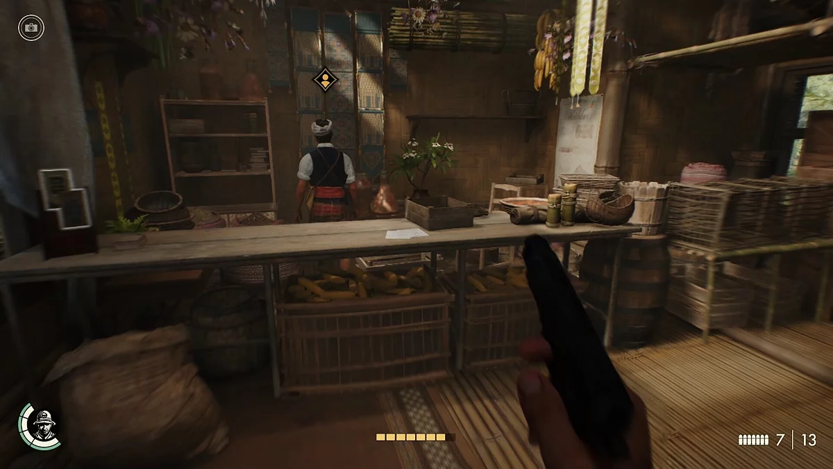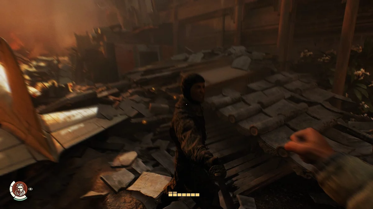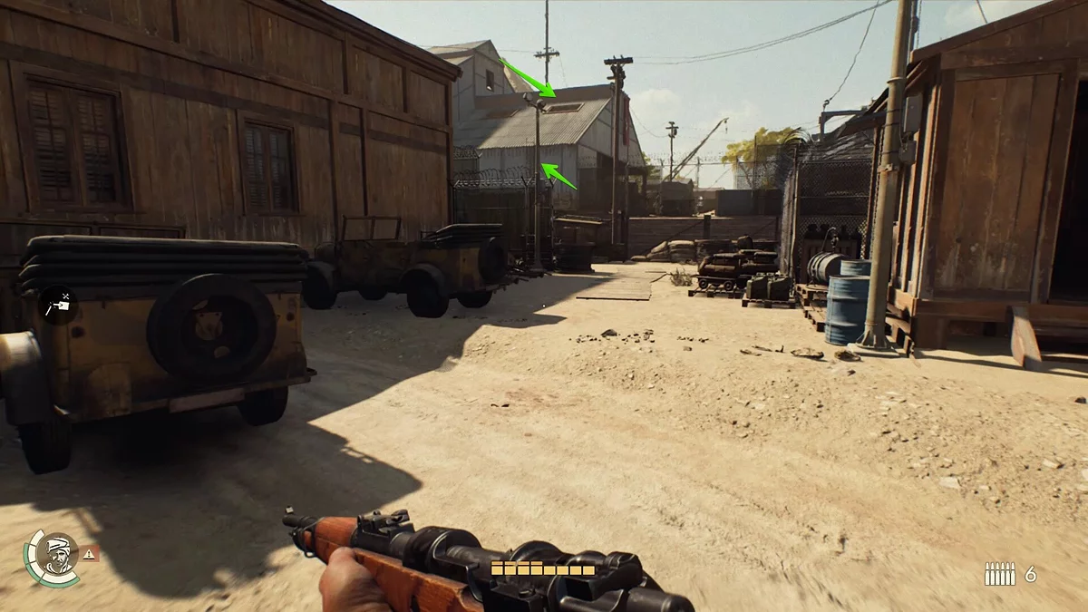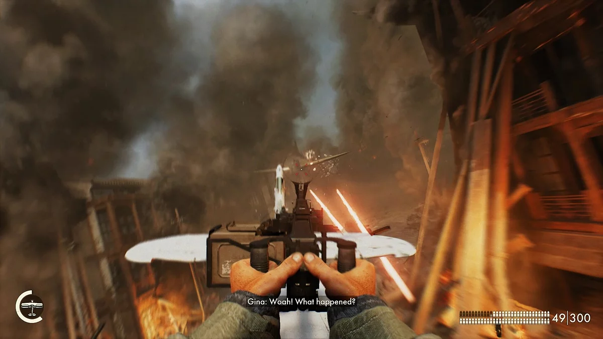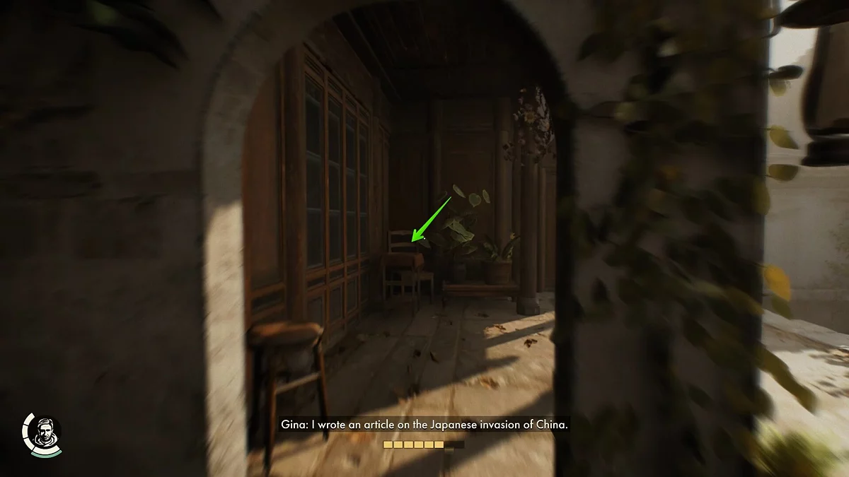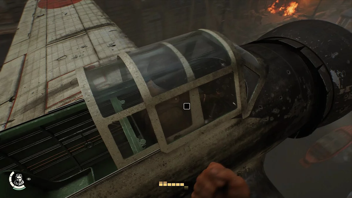 Перепрыгивайте через мост и бегите в переулок. Здесь будет ждать единственный враг — японский солдат с вакидзаси. Можете быстро расправиться с ним голыми руками, пока он пытается продемонстрировать вам свой клинок. Также не забудьте сделать фото упавшего самолёта. А поднявшись по обломкам здания на второй этаж, заберите обожженную карту. Неподалёку не пропустите книгу навыков Bob & Weave.