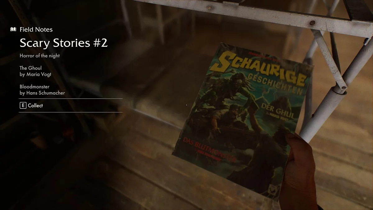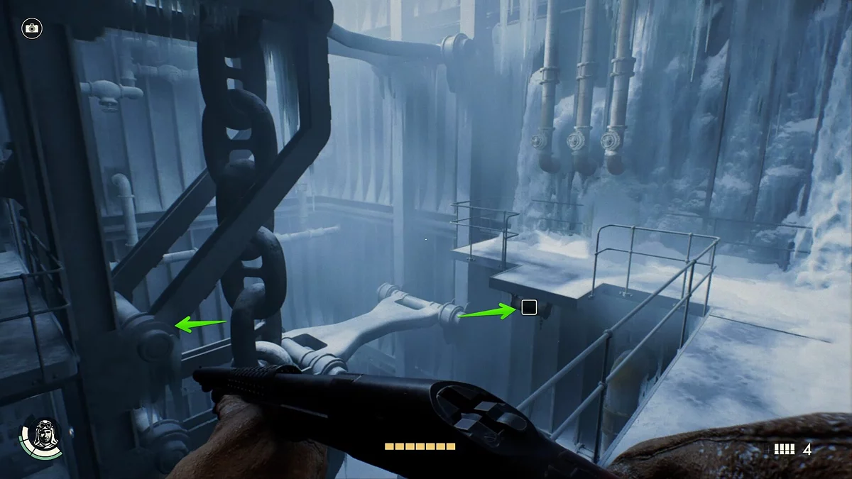 Когда будете готовы, двигайтесь по единственному пути к трехэтажному отсеку. Спуститесь на первый этаж при помощи кнута и заберитесь наверх рядом с якорной цепью. Потяните штоки, удерживающие якорь, затем можете осмотреть заблокированное льдом помещение. Предварительно нужно скинуть вниз любое двуручное оружие (заберите дробовик или автомат у мертвых фрицев, нажмите клавишу Е, чтобы взять его двумя руками, затем разбейте лёд). В этой комнате вы найдёте патроны для револьвера и книгу комиксов Scary Stories #3.