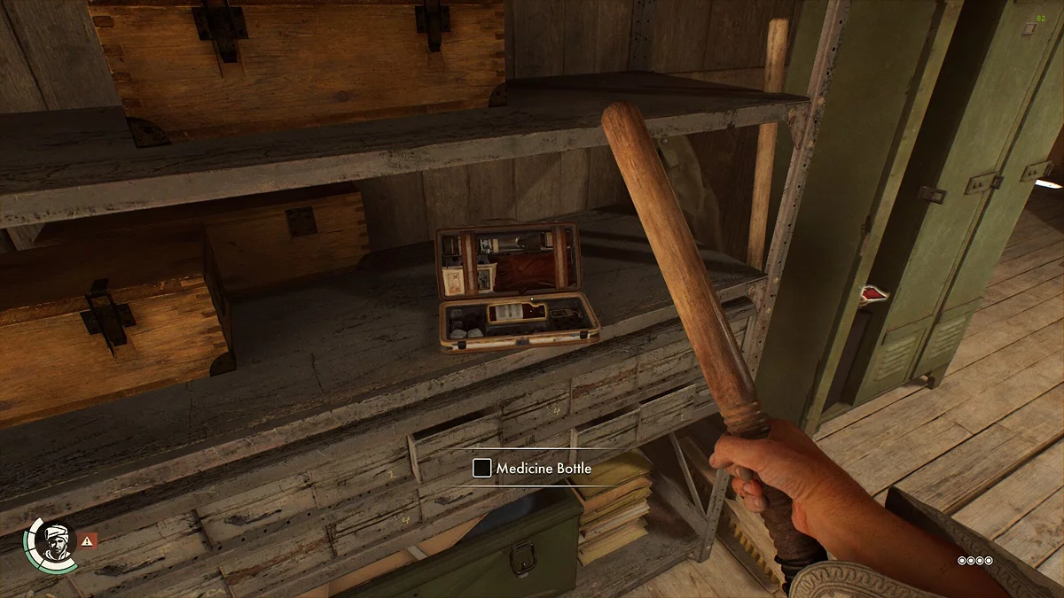 Поднимитесь на второй этаж и вырубите патрульного. На звуки придёт солдат с собакой — следуйте в соседнюю комнату и исследуйте её. На столе у выхода заберите книгу (Lucky Hat I), несколько бинтов и ключ Капитана.