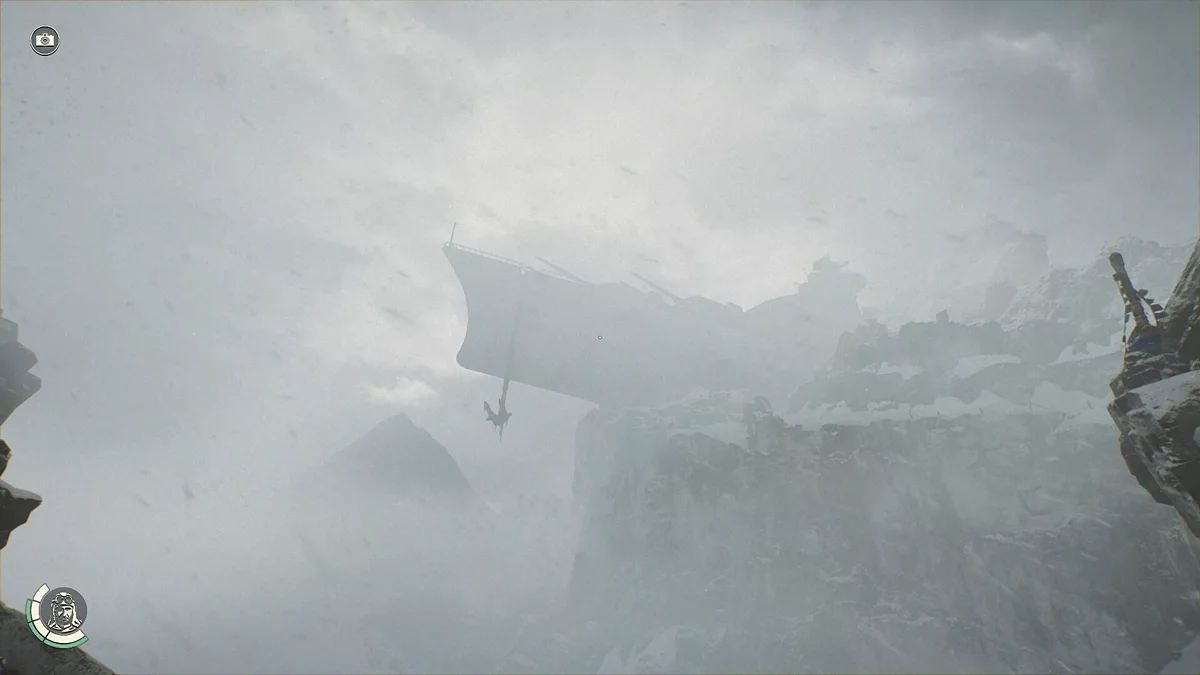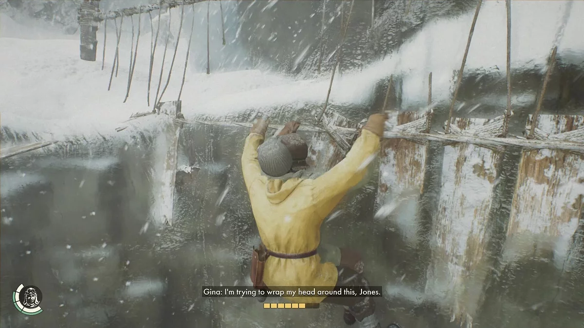 Пробирайтесь по заснеженным уступам скал до деревянного моста. Когда мост частично обвалится, используйте кнут, чтобы ухватиться за уступ и подтянитесь. Пройдите через небольшую пещеру. Когда выберетесь наружу, увидите огромный боевой корабль фашистов — можете сфотографировать его.