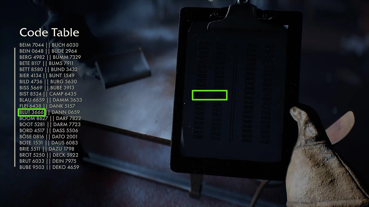 Теперь, когда вы получили правильный шифр, возьмите планшет со стола и осмотрите его. В левом столбце можно обнаружить комбинацию букв и код — 3666. С его помощью вы сможете открыть дверь.