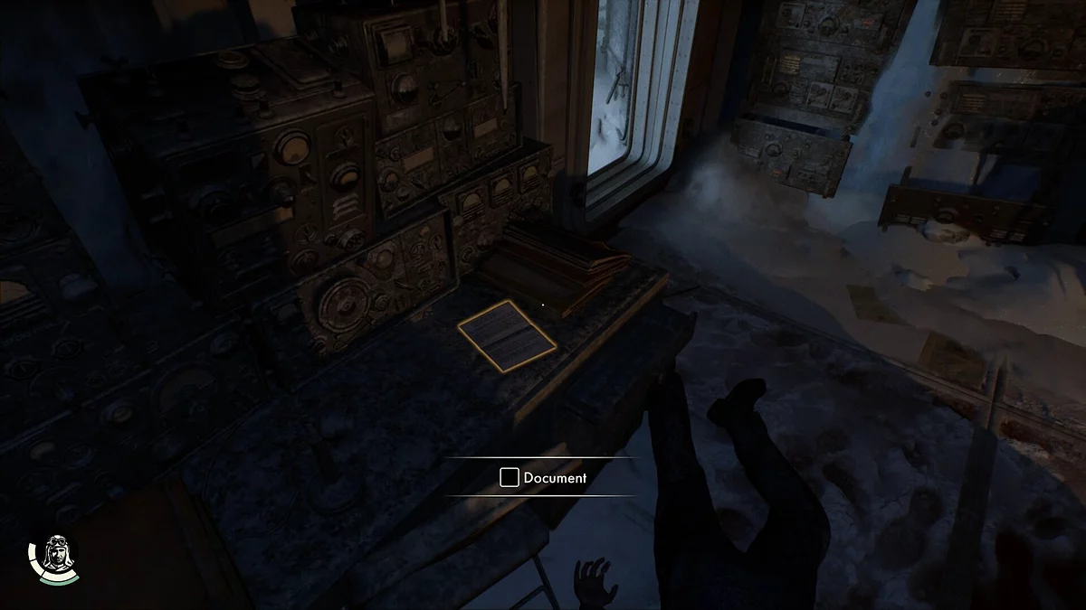 Войдите в следующий отсек. Здесь будет ещё один фриц, а на столе можно найти документ. Если разбить лёд в небольшое помещение, подберёте зарисовку на бумаге.