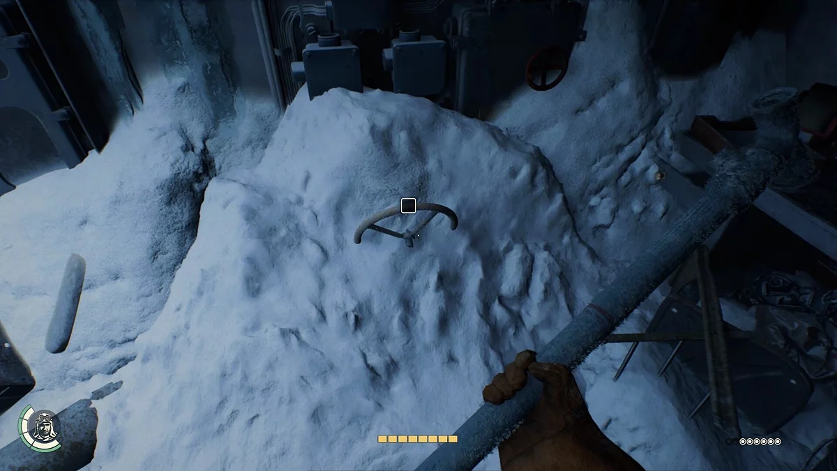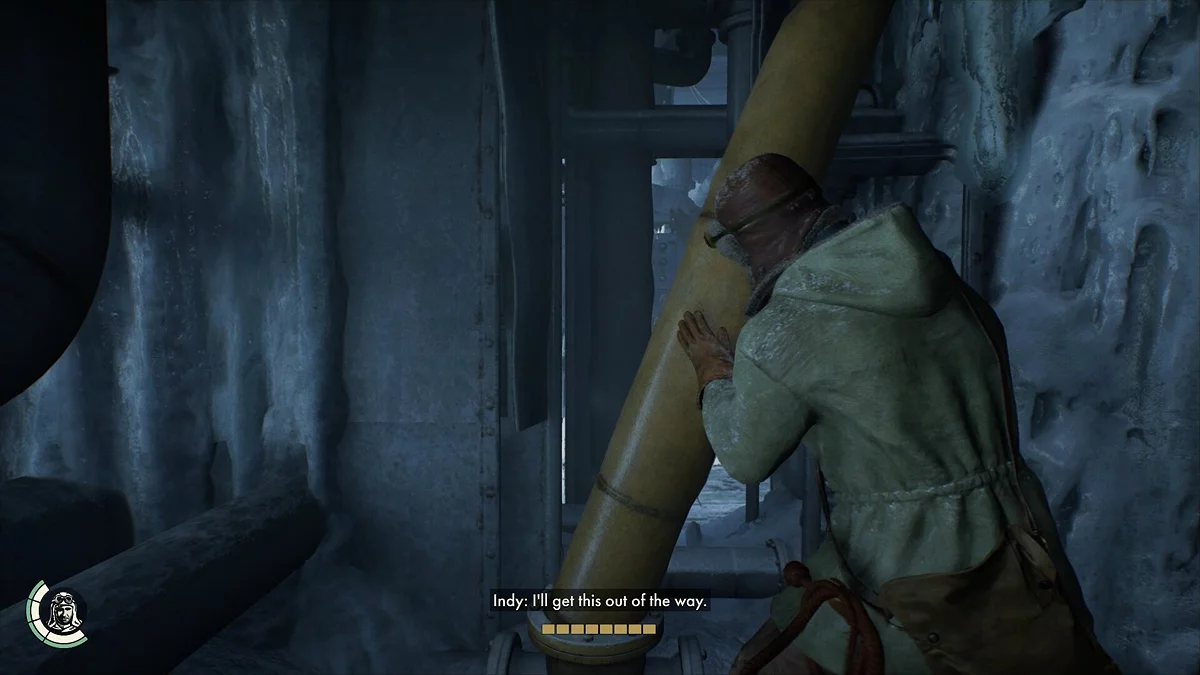 Оказавшись на борту, осмотрите коридор и ответвление справа. При изучении двери Индиана издаст реплику об отсутствующем ручном штурвале для открытия гермозатвора. Бегите в соседнюю комнату, предварительно захватив с собой металлическую трубу. Используйте двуручное оружие на обледенелом проходе и осмотритесь. Штурвал будет лежать в снегу.