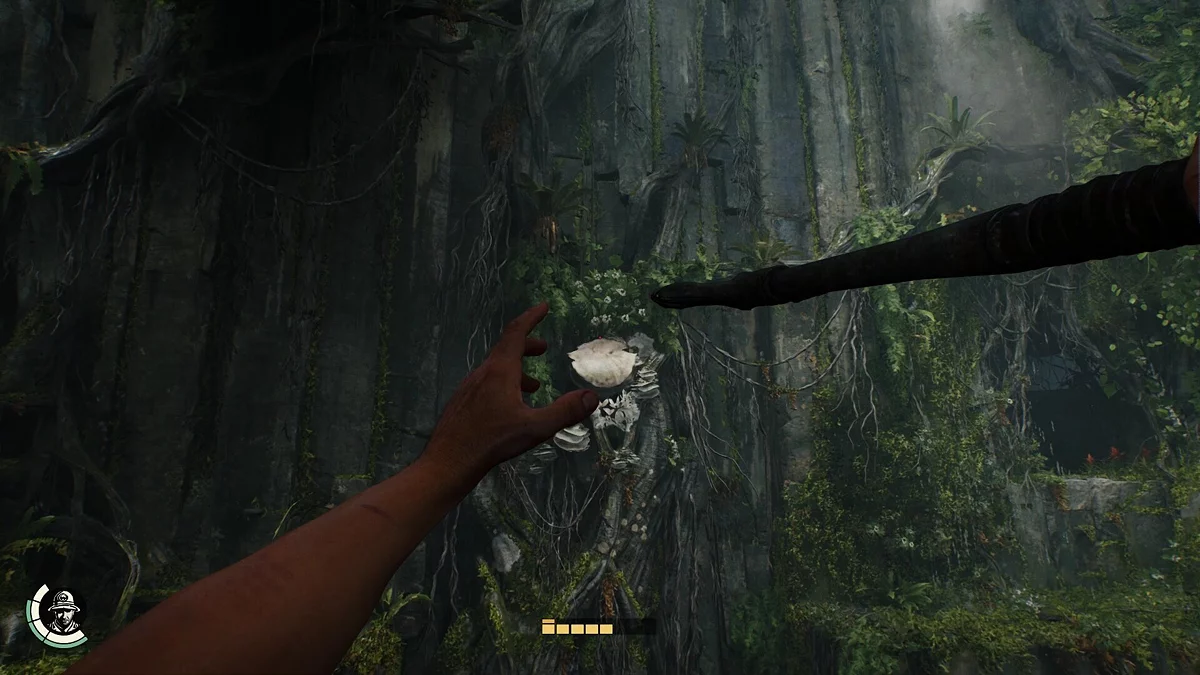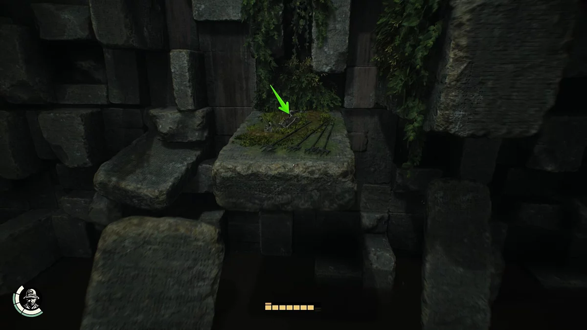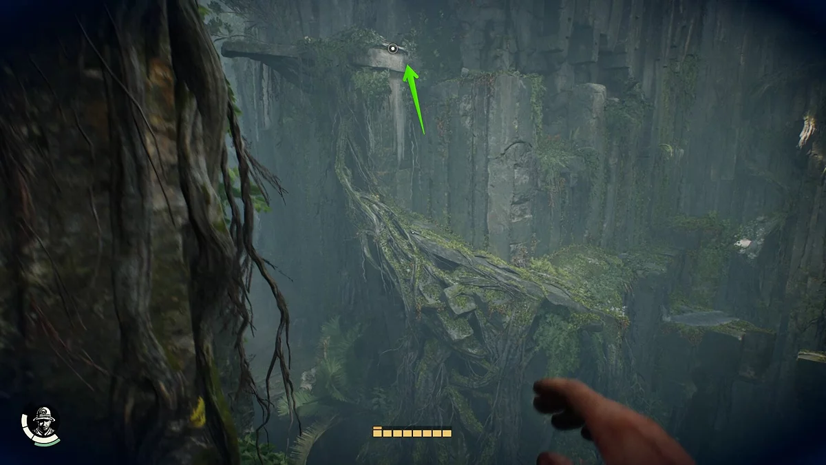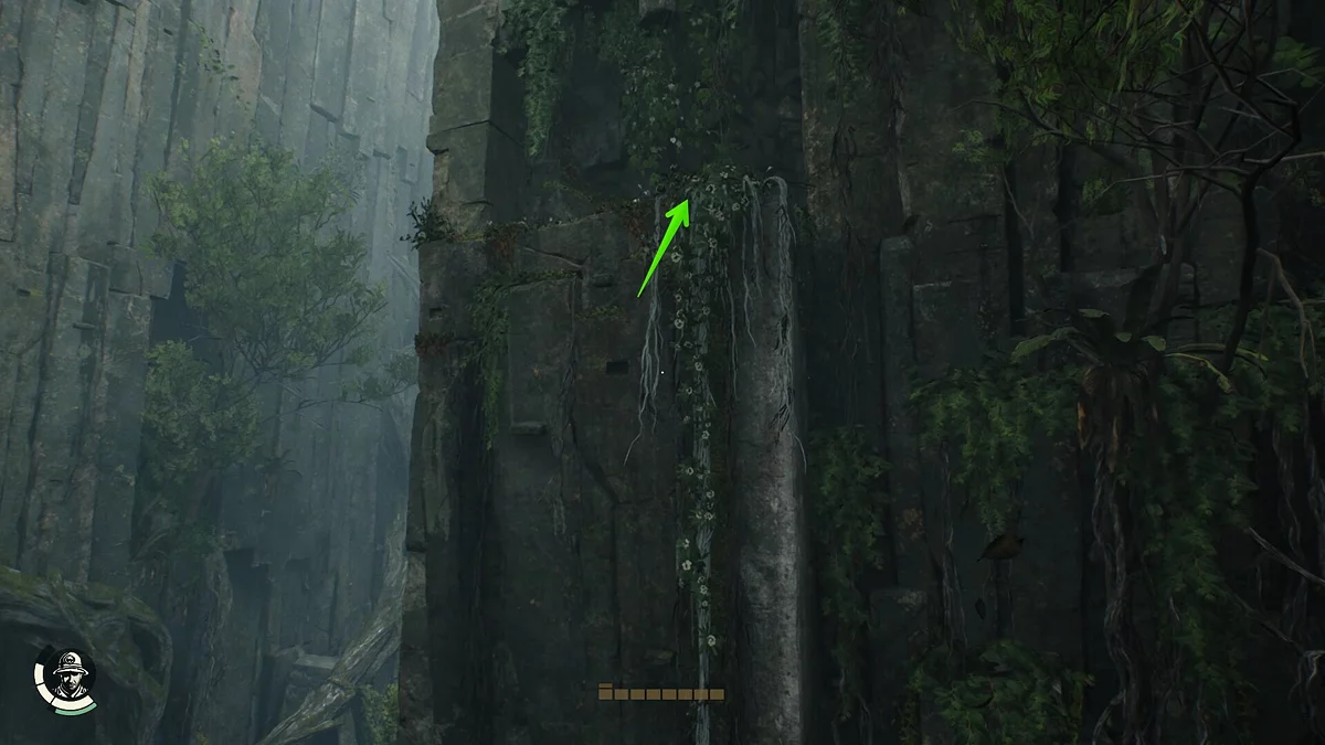 Выбравшись, снова воспользуйтесь гарпуном и переберитесь на другую сторону. Со скалы будет свисать растение — используйте его, чтобы подняться выше. Когда ухватитесь кнутом и проползёте по уступу за угол, спрыгивайте и бегите вперёд, затем направо. Если сейчас пойти налево через обрыв, то пропустите древнюю реликвию. Используйте кнут, подтянитесь и возьмите коллекционный предмет.