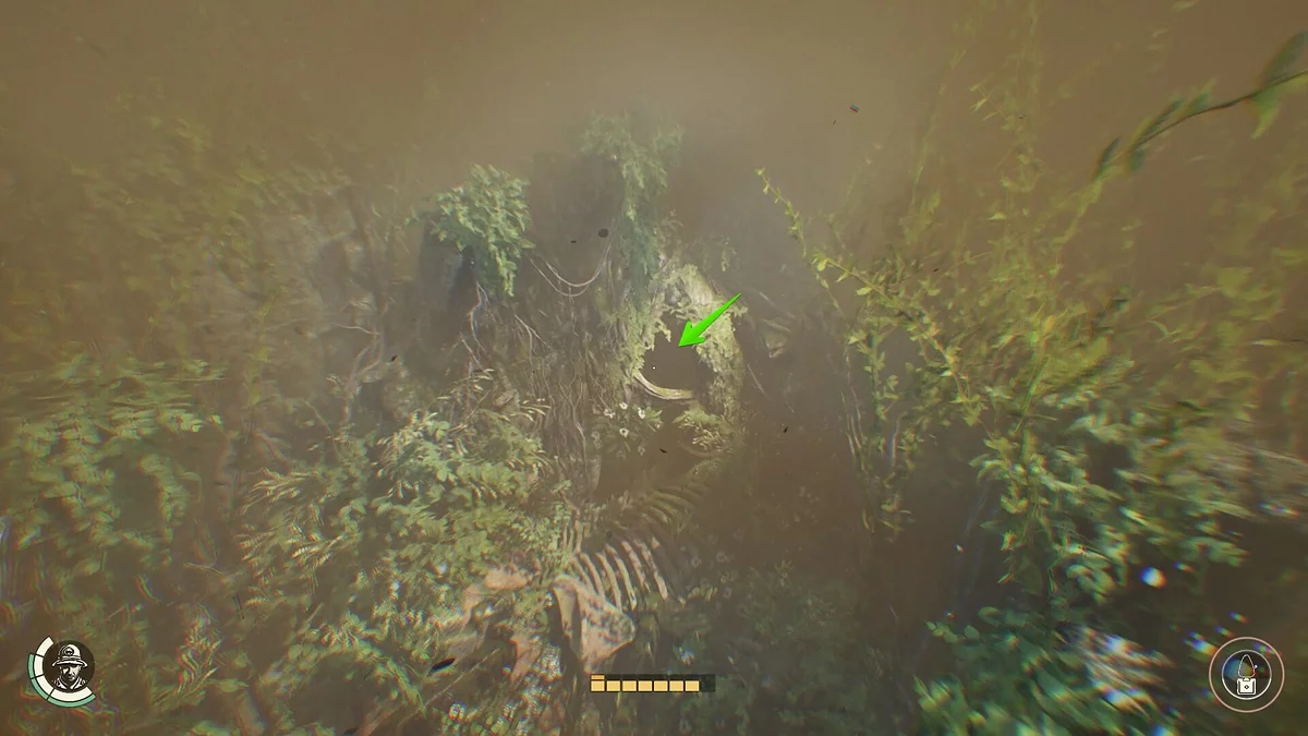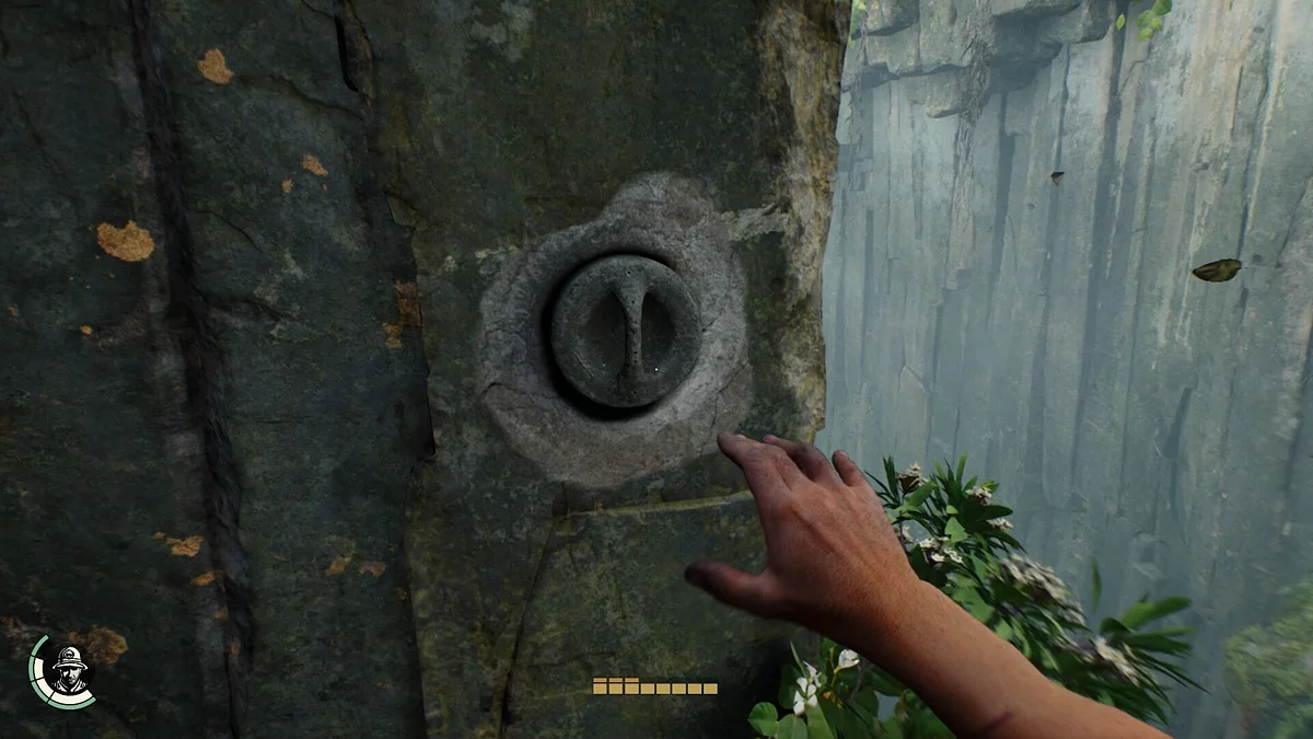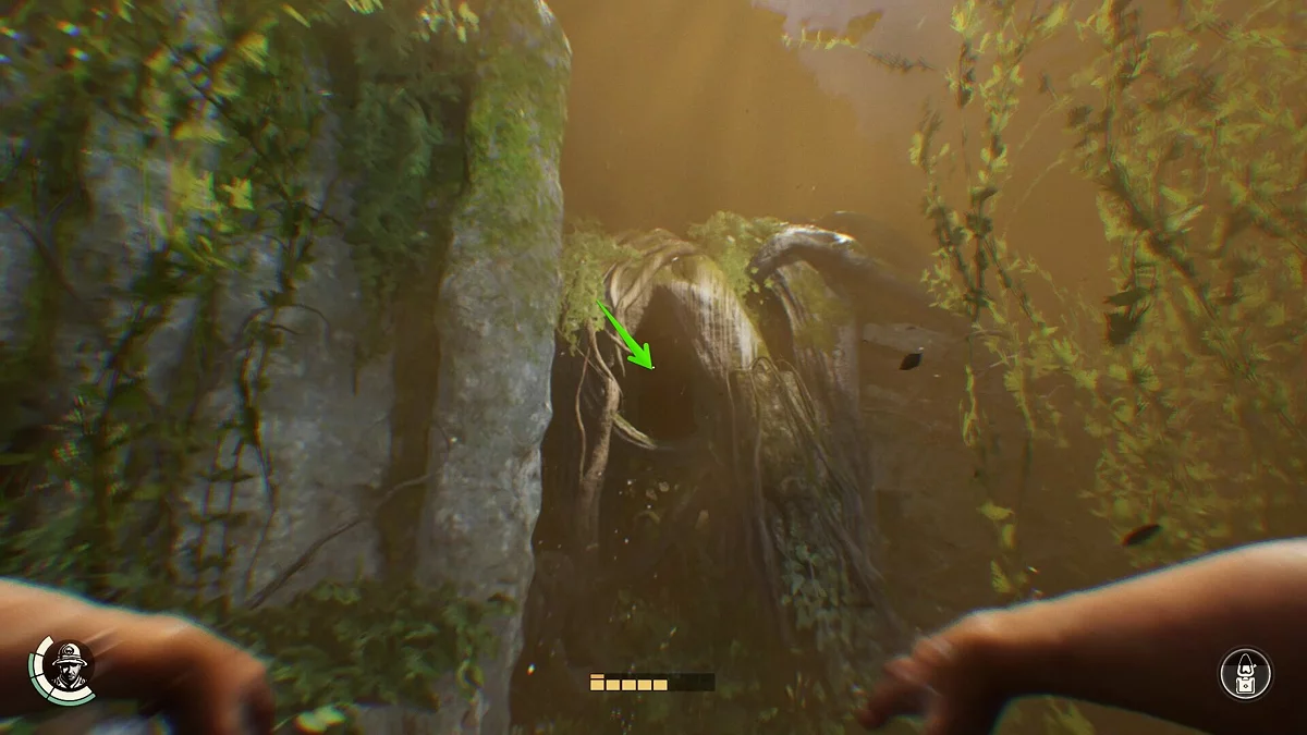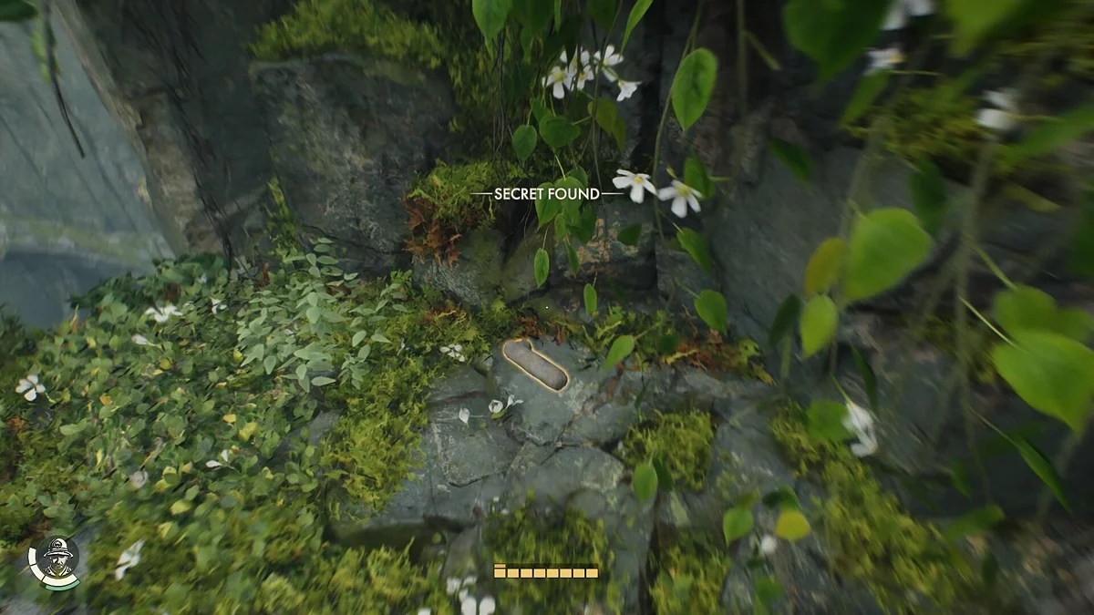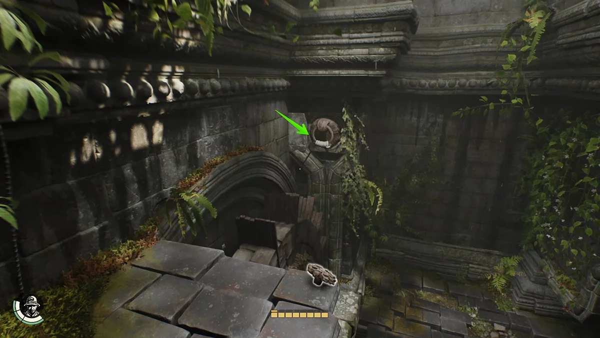 Выбравшись, снова воспользуйтесь гарпуном и переберитесь на другую сторону. Со скалы будет свисать растение — используйте его, чтобы подняться выше. Когда ухватитесь кнутом и проползёте по уступу за угол, спрыгивайте и бегите вперёд, затем направо. Если сейчас пойти налево через обрыв, то пропустите древнюю реликвию. Используйте кнут, подтянитесь и возьмите коллекционный предмет.