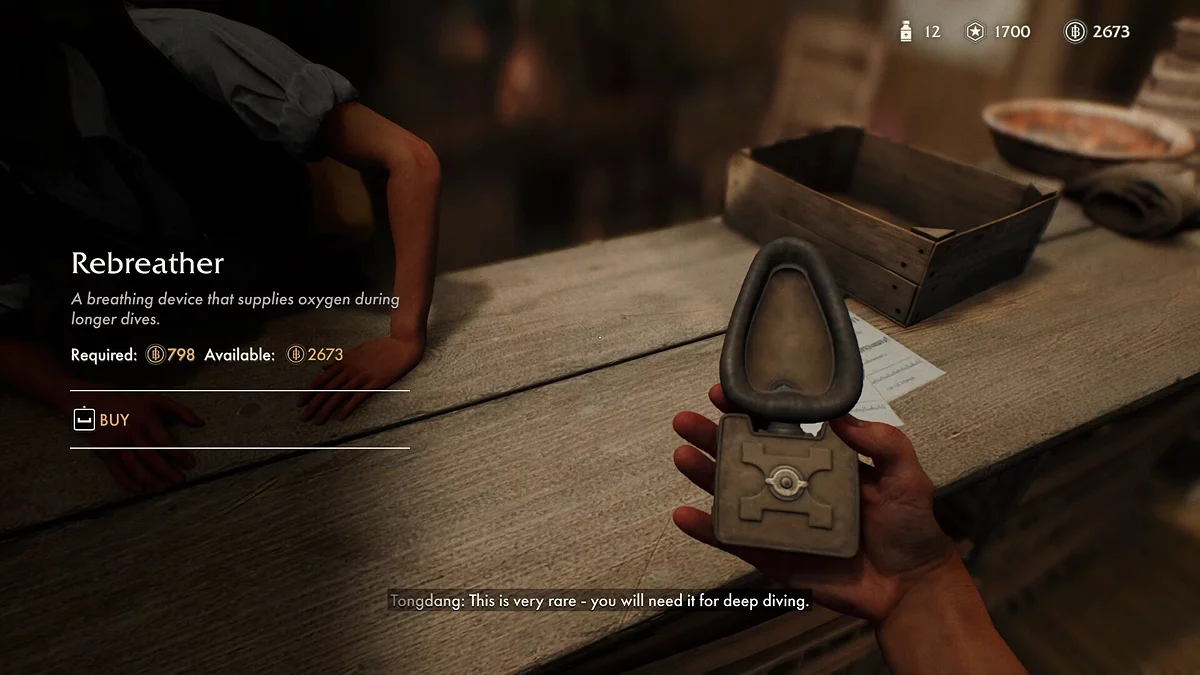 На данном этапе игра предлагает вам отправиться к торговцу для приобретения специального устройства, при помощи которого вы можете дышать под водой. Просто следуйте за маркером на карте, войдите в единственную хижину на небольшом острове и купите предмет за 798 купюр.